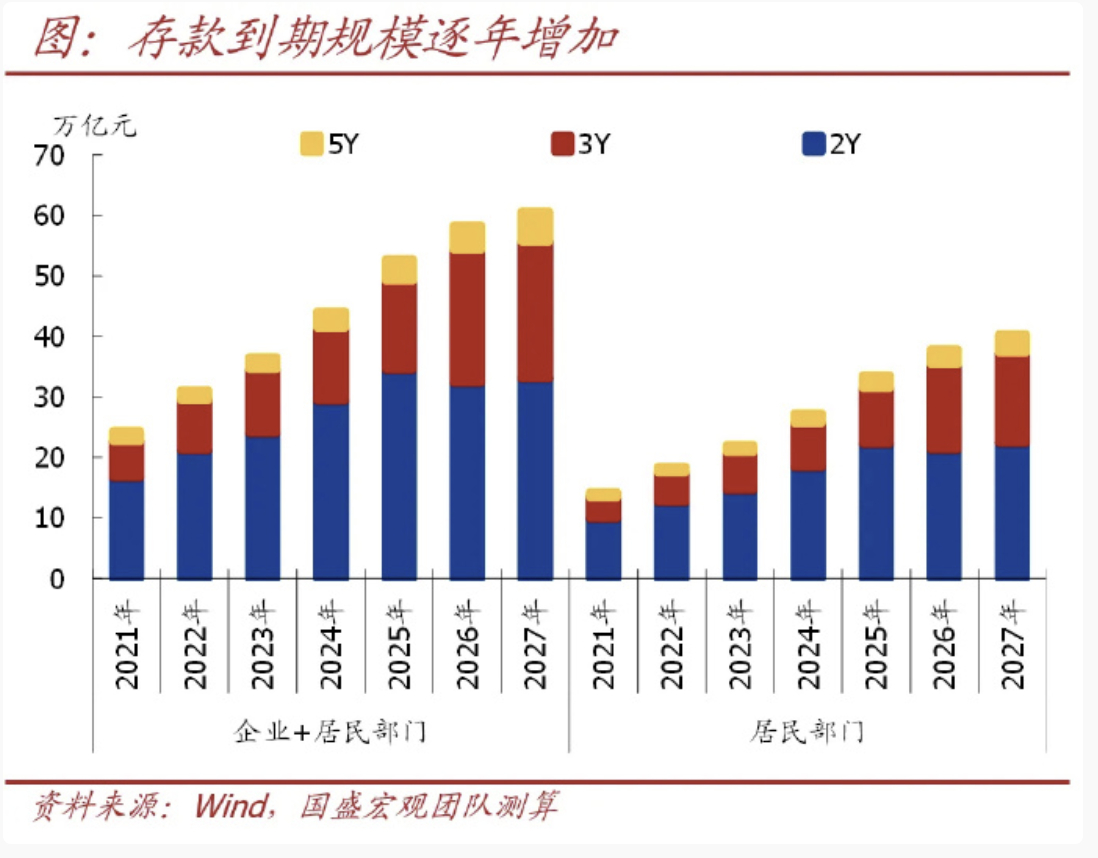 国盛宏观测算,2026年居民存款到期规模将达到37.9万亿元,较2025年多增4.3万亿元,为近5年最高水平,以前我微博讲过这个,可以搜下的