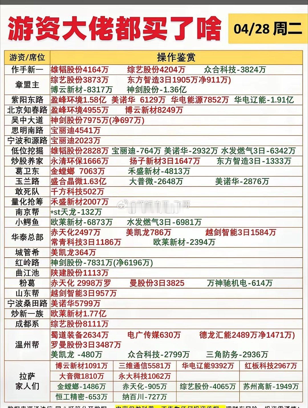 4月28日 游资龙虎榜全拆解!顶级大佬真实操盘方向曝光🔥🟥 顶级游资大手笔进场- 紫阳东路:爆买盈峰环境1.58亿,同时加仓美诺华、华电能源,高位切换明显- 玉兰路:重仓扫货盛合晶微1.63亿,半导体标的获大额加持- 炒新一族:单日狂砸欧莱新材1.77亿,次新小票获强资金青睐- 章盟主:多线布局综艺股份、东方智造,低位补涨标的同步卡位- 作手新一:接力雄韬股份、综艺股份,连板人气标的精准接力- 吴中大道:净买入神剑股份697万,高位分歧仍获资金承接🟩 大佬果断离场兑现- 章盟主:大额卖出神剑股份1.36亿,高位连板标的顺势落袋- 红岭路:卖出神剑股份7831万,净卖出6196万,资金态度谨慎- 紫阳东路:清仓式卖出华电辽能1.91亿,前期龙头彻底兑现离场- 葛卫东:卖出禾盛新材4813万,高位标的批量兑现浮盈⚙️ 量化资金快进快出量化打板席位今日多线作战,快进快出特征明显:- 大额买入:恒工精密、永清环保、中晶科技等低位标的- 大额卖出:飞南资源、智微智能、众合科技等前排标的短线资金分歧加剧,高低切换动作明显🏛️ 机构资金大举扫货机构今日火力全开,多线布局:- 重仓买入:大普微1.92亿、禾盛新材1.17亿、永太科技1.14亿、东方材料1.23亿- 高位兑现:神剑股份、众合科技、飞南资源等标的遭大额减仓机构资金高低切换,低位补涨标的获明显青睐🚀 拉萨天团全面出击散户大本营集体进场大普微、浙江世宝、圣阳股份、综艺股份等一众热门小票,人气抱团热度拉满💡 今日盘面核心总结1. 高位连板标的分歧加剧,神剑股份、华电辽能等前期龙头遭资金兑现2. 低位补涨、次新、半导体等方向获游资和机构资金同步布局3. 游资高低切换明显,从高位妖股转向低位轮动标的4. 市场情绪分歧加大,控仓博弈成为关键⚠️ 温馨提示:仅为龙虎榜数据客观梳理,不构成任何投资建议今日复盘今日A股股市分析股市点评龙虎榜