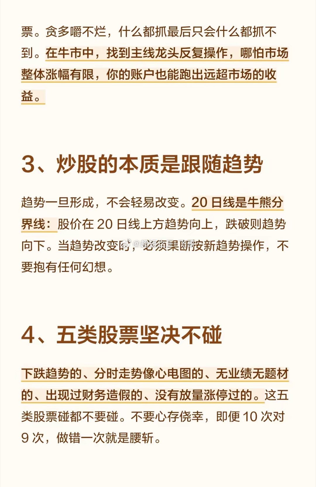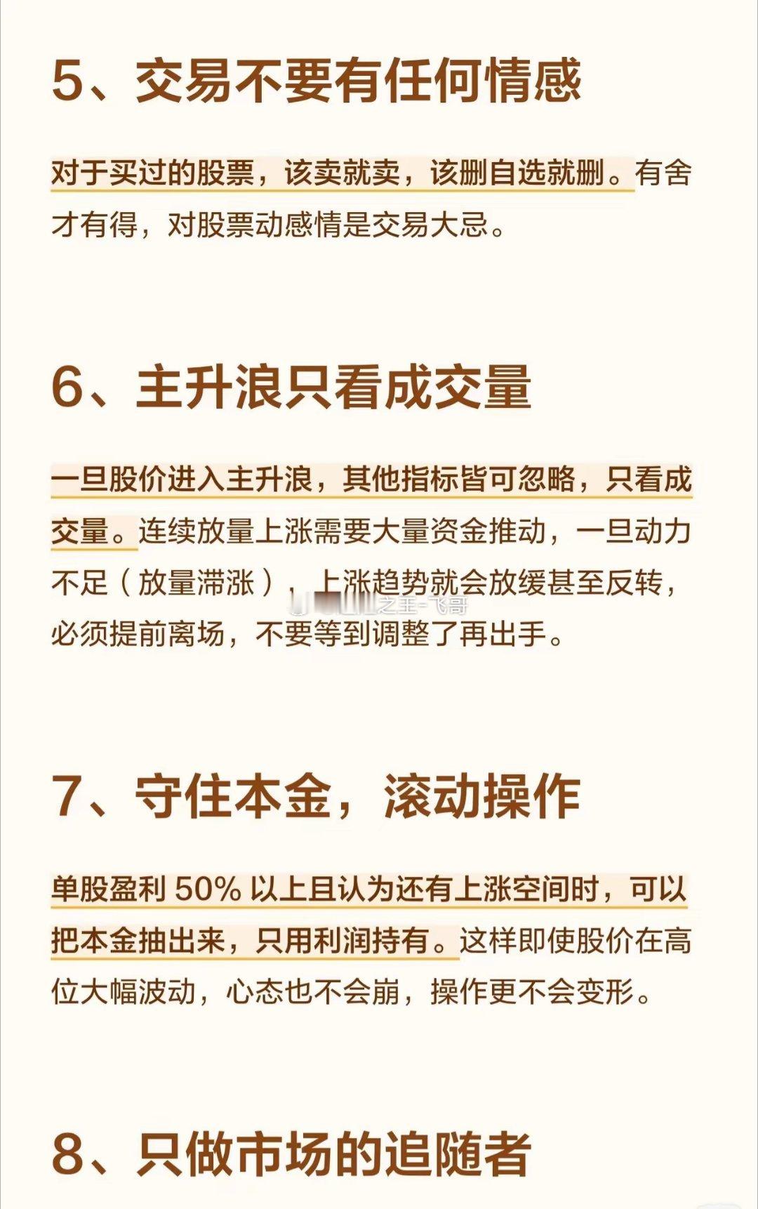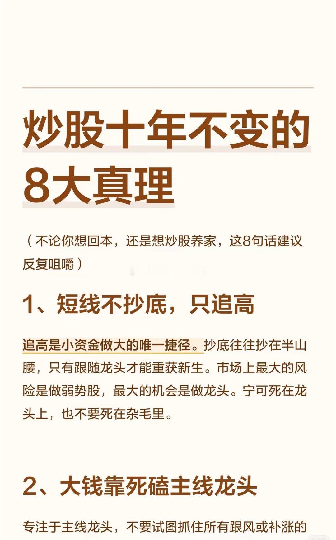 炒股十年不变的8大真理(无论你是想回本解套,还是立志炒股养家,这8句箴言都值得反复咀嚼)1、短线不抄底,只追高追高是小资金做大的唯一捷径。抄底往往容易抄在半山腰,只有跟随龙头才能重获新生。市场上最大的风险是做弱势股,最大的机会是做龙头。宁可死在龙头上,也不要死在杂毛里。2、大钱靠死磕主线龙头专注于主线龙头,不要试图抓住所有跟风或补涨的票。贪多嚼不烂,什么都抓最后只会什么都抓不到。在牛市中,找到主线龙头反复操作,哪怕市场整体涨幅有限,你的账户也能跑出远超市场的收益。3、炒股的本质是跟随趋势趋势一旦形成,不会轻易改变。20日线是牛熊分界线:股价在20日线上方趋势向上,跌破则趋势向下。当趋势改变时,必须果断按新趋势操作,不要抱有任何幻想。4、五类股票坚决不碰下跌趋势的、分时走势像心电图的、无业绩无题材的、出现过财务造假的、没有放量涨停过的。这五类股票碰都不要碰。不要心存侥幸,即便10次对9次,做错一次就是腰斩。5、交易不要有任何情感对于买过的股票,该卖就卖,该删自选就删。有舍才有得,对股票动感情是交易大忌。6、主升浪只看成交量一旦股价进入主升浪,其他指标皆可忽略,只看成交量。连续放量上涨需要大量资金推动,一旦动力不足(放量滞涨),上涨趋势就会放缓甚至反转,必须提前离场,不要等到调整了再出手。7、守住本金,滚动操作单股盈利50%以上且认为还有上涨空间时,可以把本金抽出来,只用利润持有。这样即使股价在高位大幅波动,心态也不会崩,操作更不会变形。8、只做市场的追随者周期的起伏、个股的涨跌都是市场规律。不要妄图猜测接下来会怎样,而应根据市场走势和量能去判断。当主力拿真金白银进场、指数多头排列、量能逐步充沛时,才是最确定的进场点。条件不满足时就是等,顺势而为才是王道。(注:以上内容为投资经验分享,不构成具体买卖建议。股市有风险,入市需谨慎。)