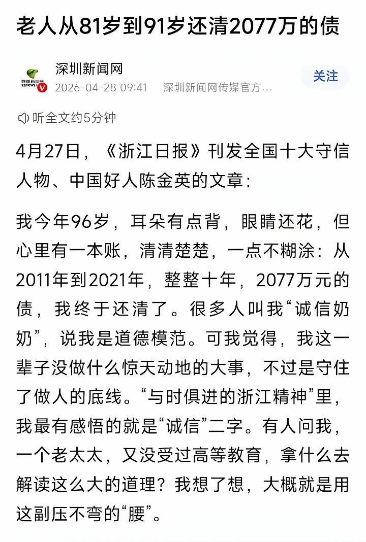 《浙江日报》刊发的这位老人,硬是在81岁至91岁的这十年间,创业成功,还清2077万债务。 用十年光阴还清 2077 万元巨额债务,靠的是 “诚信” ,靠的是不服输的创业。 “诚信”“创业”就是最动人、最有力量的时代注脚。 一个八十多岁的普通老人,用十年的时间,为这个时代默默的树立了一个时代的榜样。 用“诚信”做为自己为人处世的基本原则,不怕艰难,无畏无惧的去做事,你也是一个了不起的人。 致敬96岁老人“陈金英”,树立了一个巍巍丰碑。浙江人创业精神 名人诚信困局 百岁企业家 温州创业楷模
