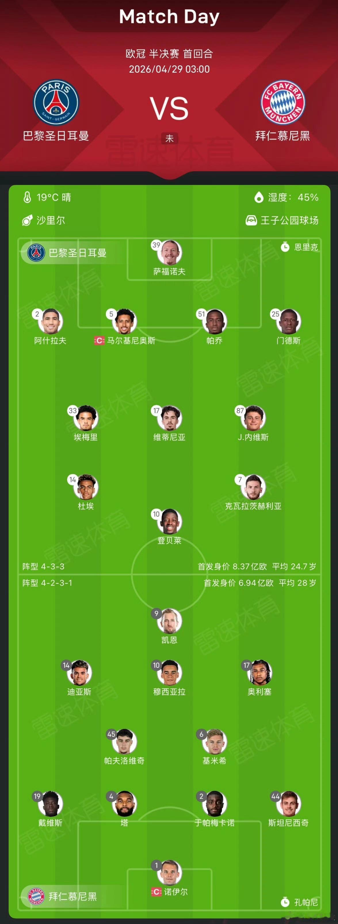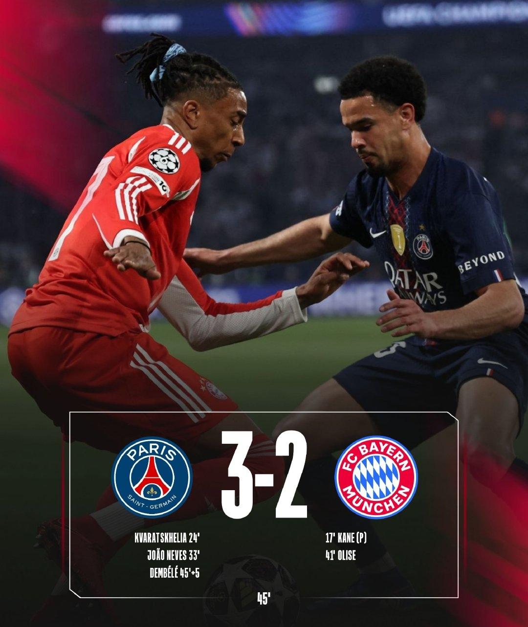 欧冠半决赛首回合,大巴黎对阵拜仁,精彩的进球大战!半场就进了5个,感觉谁赢了,谁就是冠军。 两队首发身价超过15亿欧元,巴黎8.37亿欧元,拜仁6.94亿欧元。 半场结束,大巴黎3-2领先拜仁。