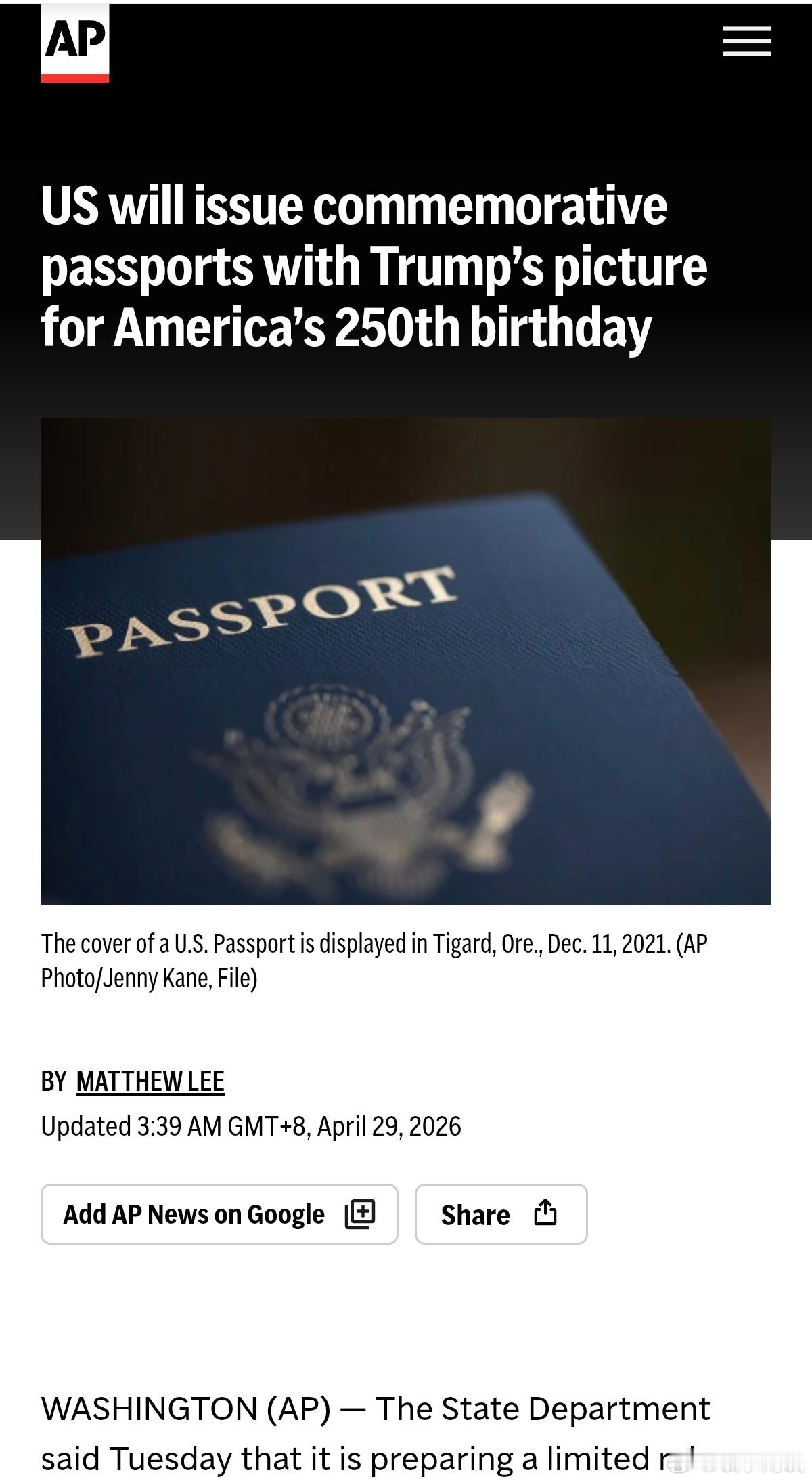 忠诚度……(美联社)美国国务院周二表示,正准备限量发行纪念美国建国250周年的美国护照,护照上印有总统唐纳德·特朗普的照片,他将成为首位出现在旅行证件上的在任总统。