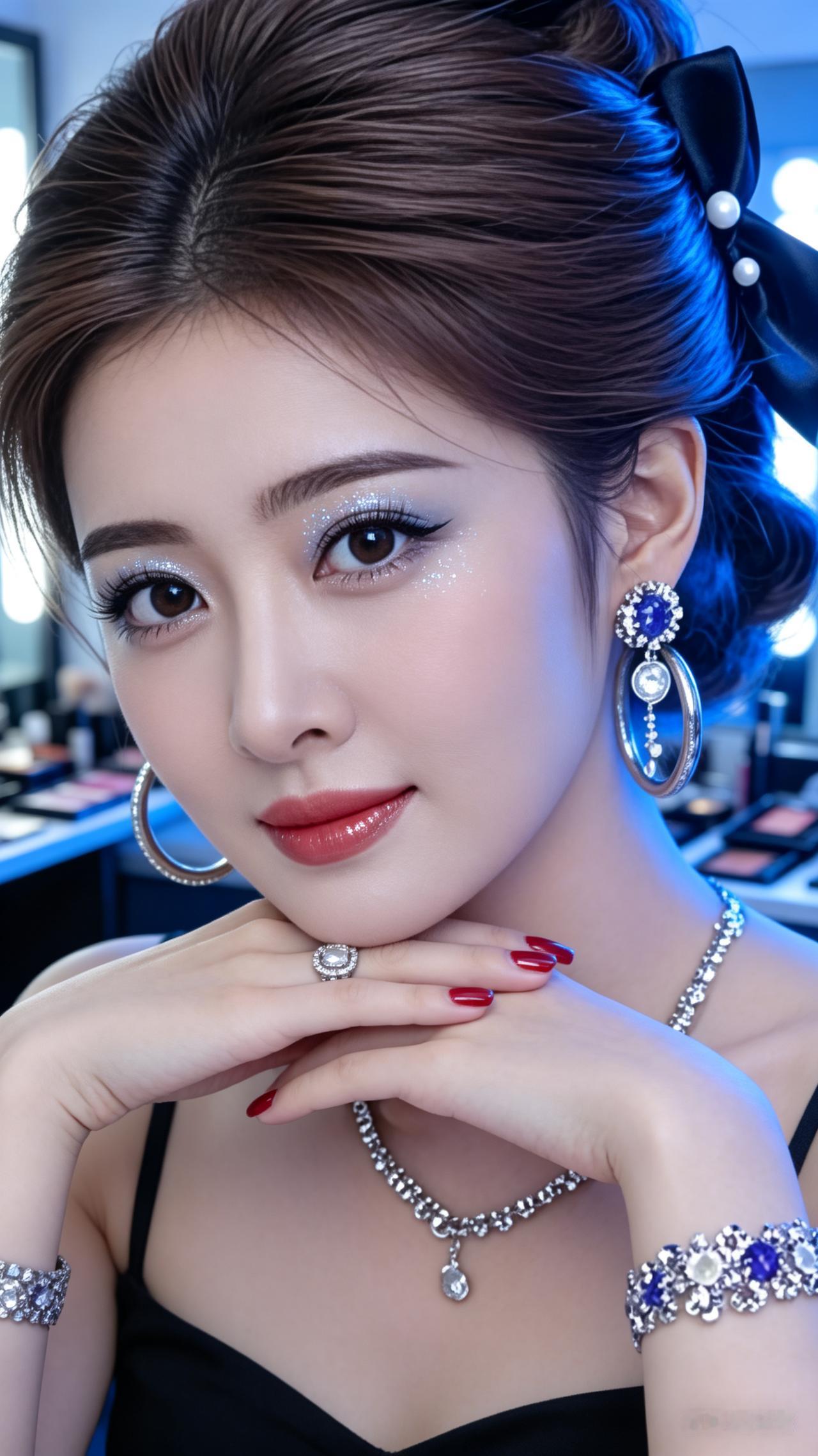 四十岁优雅女性,精致冷调细闪眼妆,唇面透亮。盘发利落,身着黑色吊带,银饰配饰齐全,红亮美甲华贵。冷蓝化妆间氛围,光影高级,尽显成熟时尚气质。