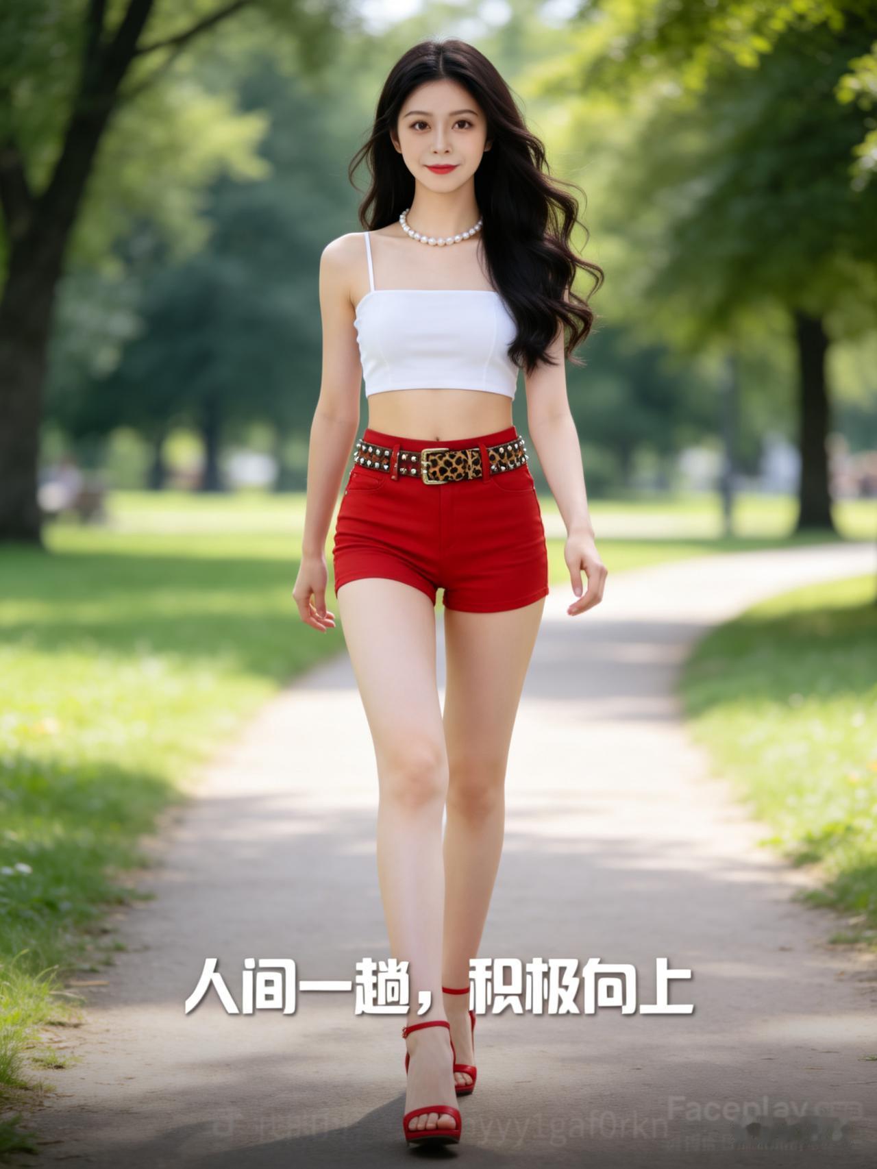 美女黑色微卷长发飘逸灵动,白吊带露脐短衫搭配红修身短裤,铆钉豹纹腰带点缀,脚踩红色细高跟凉鞋。漫步公园小路,自然光氛围感拉满,写真质感十足。