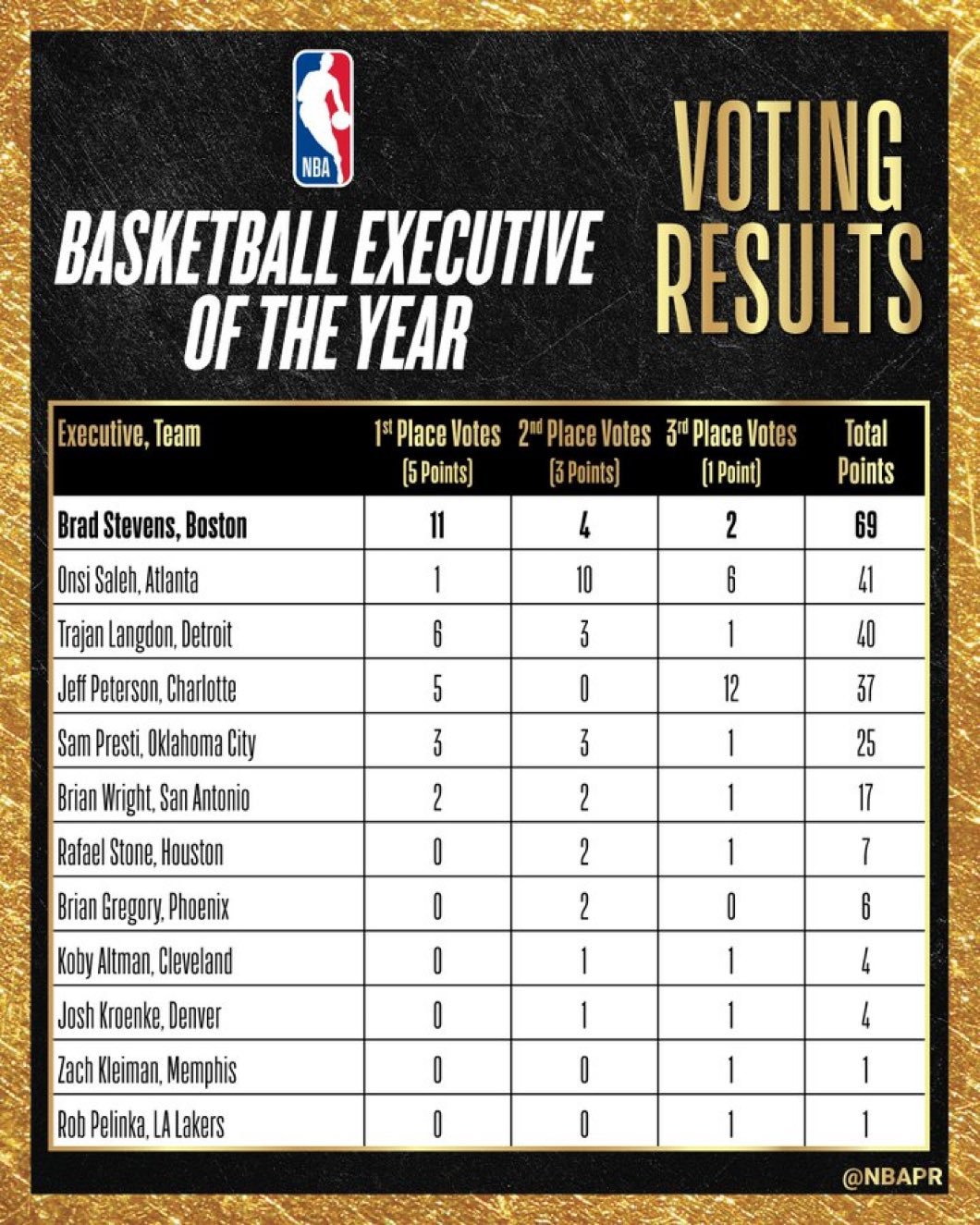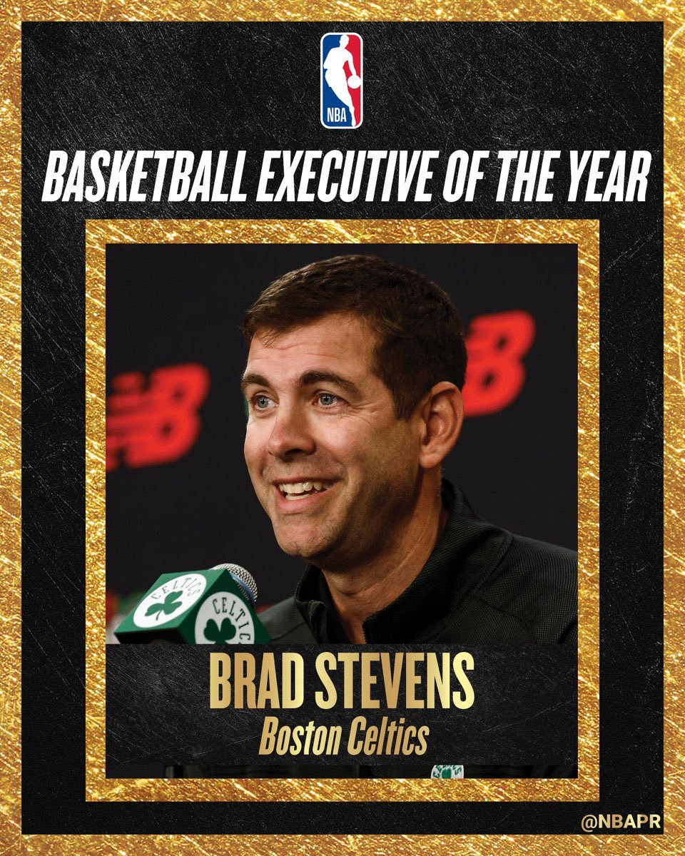 凯尔特人总经理布拉德-史蒂文斯时隔一个赛季再度当选最佳高管,赛季中期的多笔交易不但极大的减轻球队薪资压力,还补充了即战力和内线深度,帮助凯尔特人在塔图姆缺席大半个赛季的情况等以东部第二的身份晋级季后赛。