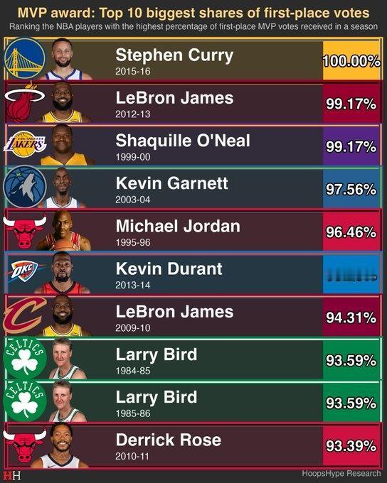 MVP第一选票得票率top10: 1、库里(2016年)——100% 2、詹姆斯(2013年)——99.17% 2、奥尼尔(2000年)——99.17% 4、加内特(2004年)——97.56% 5、乔丹(1996年)——96.46% 6、杜兰特(2014年)——95.20% 7、詹姆斯(2010年)——94.31% 8、伯德(1985)——93.59% 9、伯德(1986)——93.59% 10、罗斯(2011)——93.39% 库里是迄今为止唯一的全票MVP,詹姆斯和奥尼尔都是差了1张第一选票,且这两个投票的记者都被爆料过,是热火和湖人当年的死对头,主打一个看不顺眼,死活不投票。 而得票率前10里,很多年轻球迷会对加内特的名字感到意外。 事实情况是,当年的加内特,是顶级攻防一体的大前锋,他不仅仅在媒体口中享有口碑,在2K游戏里,当年的加内特,也拿到了99分的评分,在历届游戏里,加内特拿到过4次99的评分,这一点,连科比、邓肯、詹姆斯都做不到。