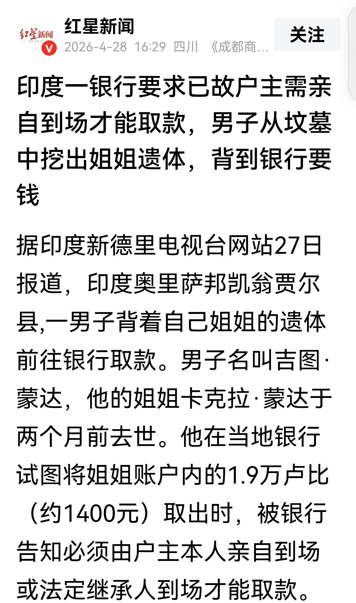 “奇葩到家了!”一女子去世,弟弟去银行取姐姐的1400元遗产,银行要求已故户主,得亲自到场才能取款,男子脸都气绿了,竟从坟墓中挖出姐姐遗体,背到银行要钱。引起舆论一片哗然。 据4月28日红星新闻报道,印度最近出了件,让人既气愤又心酸的荒唐事。 一个男子为了取姐姐账户里折合成人民币才1400块的存款,居然把下葬了2个月的姐姐遗体挖出来,直接背到了银行门口,事情曝光后整个当地都炸了锅。 男子的姐姐2个月前生病去世,名下的银行账户里还剩1.9万卢比,差不多就是1400元人民币。 男子是姐姐唯一的亲人,想着这笔钱属于自己了,虽然不多,但也应该取出来,否则就便宜银行了。 谁知道到了银行,工作人员直接告诉他,要取这笔钱,要么让户主本人来签字,要么得拿出法定继承人的证明材料,两样都没有的话肯定取不了。 男子住在偏远的农村,一辈子没怎么跟这些办事流程打过交道。 姐姐去世的时候,他也没想着去开死亡证明,根本不知道继承证明该找谁开、要跑哪些部门? 他前前后后跑了好几次银行,每次都被同样的理由挡回来,折腾得精疲力尽。 男子脑子一热就钻了牛角尖,既然银行非要见户主本人,那他把姐姐的遗体背过来,总能证明人已经去世了,总该把钱给他了吧。 说干就干,他当天就跑到姐姐的坟地,把下葬了两个月的遗体挖了出来,一路背到了银行网点。 银行的工作人员一抬头看见他背着遗体进来,当场都吓懵了,周边的路人也纷纷围过来看热闹,很快就挤得水泄不通。 围观的人知道来龙去脉之后,几乎都站在男子这边。 大家骂银行办事太死板,明明知道人家家里有人去世了,还卡着流程故意刁难,为了1400块钱逼得人做出这种大不敬的事,太没有人情味。 当地警方接到报警之后很快赶到了现场,先严肃批评了男子挖遗体的不当行为。 毕竟,按照当地习俗,惊扰去世的亲人是很严重的事。 随后警方出面协调了民政、银行等多个部门,特事特办帮男子补齐了所有需要的材料,当场就把1400块钱取给了他。 事情处理完之后,警方又专门安排人手,帮着男子把他姐姐的遗体重新安葬妥当。 目前当地警方已经针对这件事立案调查,要求银行拿出具体的整改方案,针对偏远地区民众办事的痛点,推出更便民的措施,不能再让类似的荒唐事发生。 这事说来说去,根子还是在办事机构不够灵活,规章制度本来是为了方便人,结果反倒把人逼得做出违背伦理的事,实在是不该。 要是银行一开始能多给男子解释两句流程,或者主动帮着对接一下开证明的部门,也不至于闹到这种地步。 说到底,这事儿闹得这么难看,表面看是男子行为偏激,底子里却是办事机构的“冷血”。 1400块钱,在银行眼里可能是个微不足道的数字,但对一个偏远地区的普通人来说,这可能是生活费,更是对逝去亲人的交代。 规则固然重要,那是为了保证资金安全,但规矩是死的,人是活的。 如果银行能多一点同理心,少一点推诿,主动告诉他怎么走程序,或者帮他联系一下相关部门,男子怎么可能做出这样的事? 这种把人逼入绝境的“按章办事”,让老百姓在办事时感到无助和愤怒。 《民法典》第1123条规定,继承开始后,有遗嘱的按遗嘱,没遗嘱的按法定继承。 当事人作为唯一亲人,确实享有遗产继承权。 银行要求继承证明是为了防范冒领风险,程序本身合法。 但问题在于,当银行明知户主去世却要求其“亲自到场”时,这不仅违背了客观事实,更触碰了伦理底线。 同时,男子挖掘并背走遗体,在我国法律中属于侮辱、毁坏尸体的不法行为,不仅违反治安管理处罚法,情节严重的还可能触犯刑法。 对此,你怎么看?