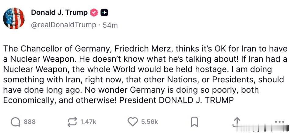 针对德国总理默茨说美国正在被伊朗羞辱,特朗普今天发帖反击。 ---------------------- 德国总理默茨认为伊朗拥有核武器是可以接受的。他根本不知道自己在说什么!如果伊朗拥有核武器,整个世界都将沦为人质。我现在正在对伊朗采取行动,这是其他国家或总统本该在很久以前就做的事情。难怪德国无论在经济上还是其他方面都表现得如此糟糕! 特朗普赞美与英国的关系,称美国“没有比英国更亲密的朋友了”。 特朗普在白宫主持仪式,接待英国国王查尔斯三世和王后卡米拉,并大力宣扬英国与美国之间的“特殊关系” 。 “自我们赢得独立以来的几个世纪里,美国人没有比英国人更亲密的朋友了,...我们拥有共同的根基,说着相同的语言,秉持着相同的价值观,我们的战士曾并肩作战,在红、白、蓝三色旗帜下捍卫着同一个非凡的文明。”