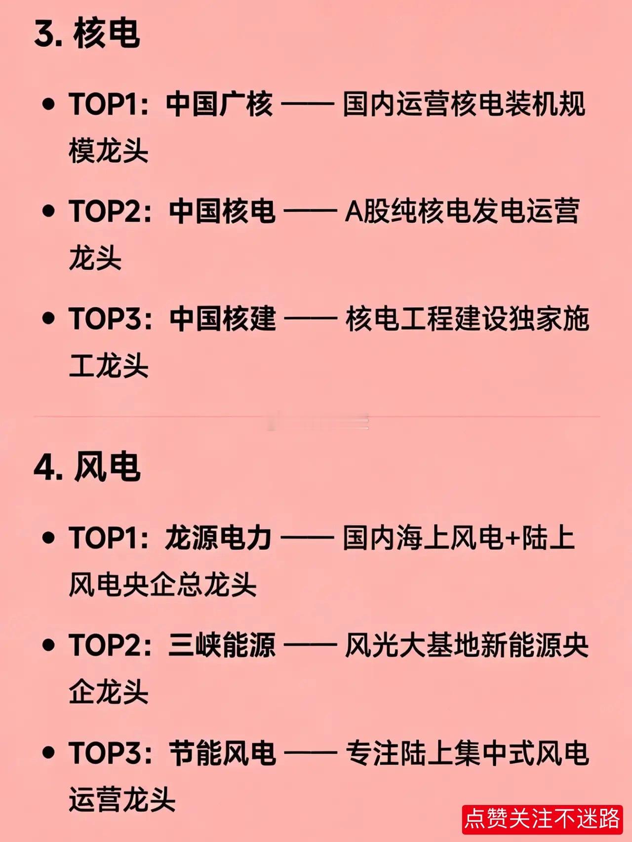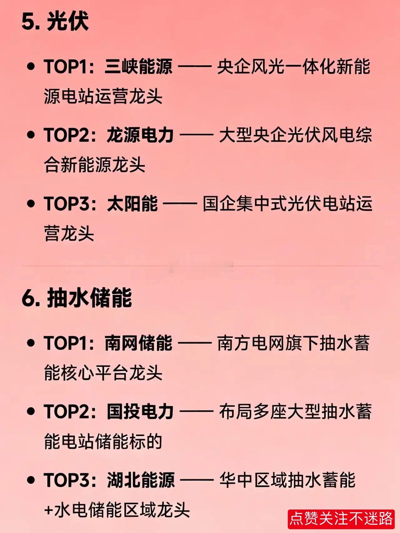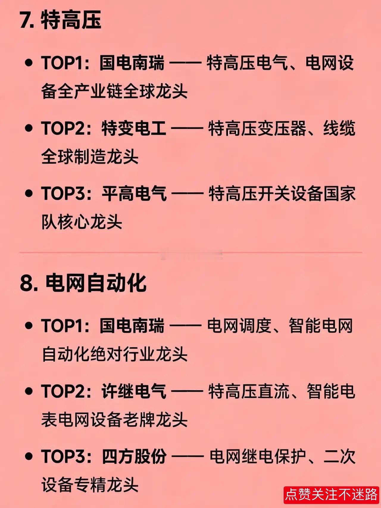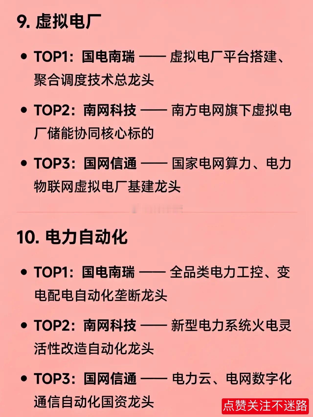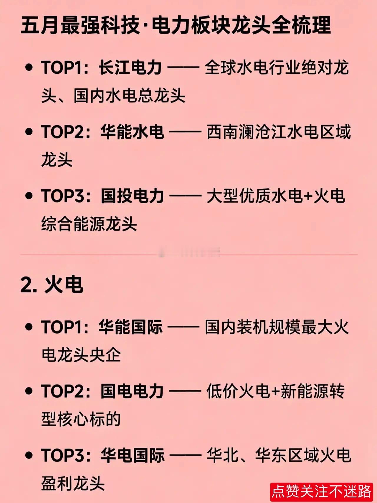 五月最强科技·电力板块龙头全梳理1、水电TOP1:长江电力——全球水电行业绝对龙头、国内水电总龙头TOP2:华能水电——西南澜沧江水电区域龙头TOP3:国投电力——大型优质水电+火电综合能源龙头2、火电TOP1:华能国际——国内装机规模最大火电龙头央企TOP2:国电电力——低价火电+新能源转型核心标的TOP3:华电国际——华北、华东区域火电盈利龙头3、核电TOP1:中国广核——国内运营核电装机规模龙头TOP2:中国核电——A股纯核电发电运营龙头TOP3:中国核建——核电工程建设独家施工龙头4、风电TOP1:龙源电力——国内海上风电+陆上风电央企总龙头TOP2:三峡能源——风光大基地新能源央企龙头TOP3:节能风电——专注陆上集中式风电运营龙头5、光伏TOP1:三峡能源——央企风光一体化新能源电站运营龙头TOP2:龙源电力——大型央企光伏风电综合新能源龙头TOP3:太阳能——国企集中式光伏电站运营龙头6、抽水储能TOP1:南网储能——南方电网旗下抽水蓄能核心平台龙头TOP2:国投电力——布局多座大型抽水蓄能电站储能标的TOP3:湖北能源——华中区域抽水蓄能+水电储能区域龙头7、特高压TOP1:国电南瑞——特高压电气、电网设备全产业链全球龙头TOP2:特变电工——特高压变压器、线缆全球制造龙头TOP3:平高电气——特高压开关设备国家队核心龙头8、电网自动化TOP1:国电南瑞——电网调度、智能电网自动化绝对行业龙头TOP2:许继电气——特高压直流、智能电表电网设备老牌龙头TOP3:四方股份——电网继电保护、二次设备专精龙头9、虚拟电厂TOP1:国电南瑞——虚拟电厂平台搭建、聚合调度技术总龙头TOP2:南网科技——南方电网旗下虚拟电厂储能协同核心标的TOP3:国网信通——国家电网算力、电力物联网虚拟电厂基建龙头10、电力自动化TOP1:国电南瑞——全品类电力工控、变电配电自动化垄断龙头TOP2:南网科技——新型电力系统火电灵活性改造自动化龙头TOP3:国网信通——电力云、电网数字化通信自动化国资龙头免责声明:发文涉及资讯图等内容来自网络公共信息。仅供科普,不构成任何依据。
