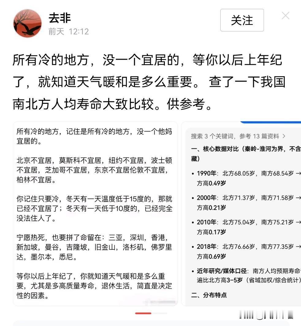 南方人吃不上肉,多活一年半载有啥意义?我在南方待过两年,冬天太冷了,是刻骨铭心的那种,夏天太热了,是怀疑人生的那种。在过去,南方是流放犯人的地方,就是惩罚犯人的地方,让他们去承受自然环境给他们带来的折磨,只有重罪的人才送到南方。南方是近年来才被重视的,那是因为世界商贸货运走水路便宜,为了节约成本,才有很多商家云集到那的。要我说,南方除了云南、贵州,没几个适合人类居住的地方。