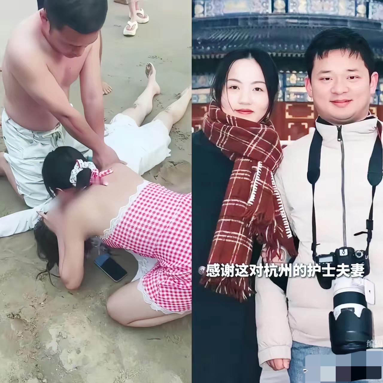 找到了!找到了!海南万宁沙滩上,为溺水女子做心脏复苏和人工呼吸的护士夫妻找到啦!丈夫是来自浙大一院余杭院区急诊监护室的主管护师姜智文,妻子是来自浙大一院余杭院区综合监护室的护士袁苑。 两人都是90后,都曾经去过海南万宁度假,都遇到过一名昏迷不醒的女游客,都不嫌弃口吐白沫的女游客,都挺身而出,用专业知识成功救下了女游客,特别是袁苑,她无视口吐白沫的女游客,为女游客做人工呼吸的样子真的太美,网友们已经将两人称为模范夫妻和最美夫妇,当之无愧! 本是放松度假的休闲时光,面对突发溺水、状况狼狈的游客,这对年轻夫妻没有丝毫犹豫,没有半分嫌弃,第一时间冲上前展开施救。在旁人手足无措的时候,他们默契配合,丈夫专业实施心脏复苏,妻子不顾污物果断做人工呼吸,用平日里练就的专业素养,从死神手里抢回了一条鲜活的生命。 很多人说,医者仁心,可这份仁心,在脱离了工作岗位、没有任何保障的突发场景里,更显珍贵。他们本可以选择旁观,本不用承担任何风险,却凭着刻在骨子里的职业担当,毫不犹豫地伸出援手。没有丝毫计较,没有半点退缩,眼里只有亟待救治的生命,这份本能,远比任何赞美都动人。 最好的爱情,从来不是甜言蜜语,而是三观相合、彼此同频。这对90后夫妻,有着同样的职业,同样的善良,同样在危难时刻选择挺身而出。他们并肩救人的模样,既是医者担当的最好诠释,也是夫妻同心的最美见证,用行动诠释了什么是双向奔赴的善良与责任。 如今社会上,总有人在危难面前犹豫退缩,总有人担心惹上麻烦选择明哲保身,而这对年轻夫妻,用最纯粹的善举,给所有人上了一课。他们用平凡人的挺身而出,让我们看到了人性的光辉,看到了年轻人的责任与担当,更看到了医者救死扶伤的初心从未改变。 网友称他们为最美夫妇、模范夫妻,这份赞誉实至名归。他们没有惊天动地的壮举,却用最朴实的善举,温暖了整个沙滩,感动了无数网友。这份不图回报、义无反顾的善良,才是这个时代最珍贵的品质,最值得我们学习的榜样。 善良从来都不是一句口号,而是危难时刻的挺身而出,是不计得失的伸手相助。这对护师夫妻,用行动证明了平凡人也能绽放出耀眼的光芒,用善举温暖了整个社会。 各位读者你们怎么看?欢迎在评论区讨论。 溺水者抢救 心肺复苏人
