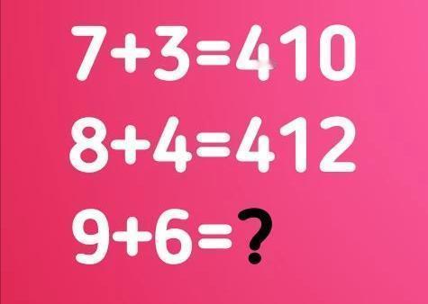 来挑战这道有趣的数字规律题!你看,前面给出了 “7 + 3 = 410”“8 + 4 = 412” 这样的式子,现在要根据前面的规律,算出 “9 + 6” 等于多少。好好观察这些数字之间的关系,找出隐藏的运算规律,然后得出答案吧。