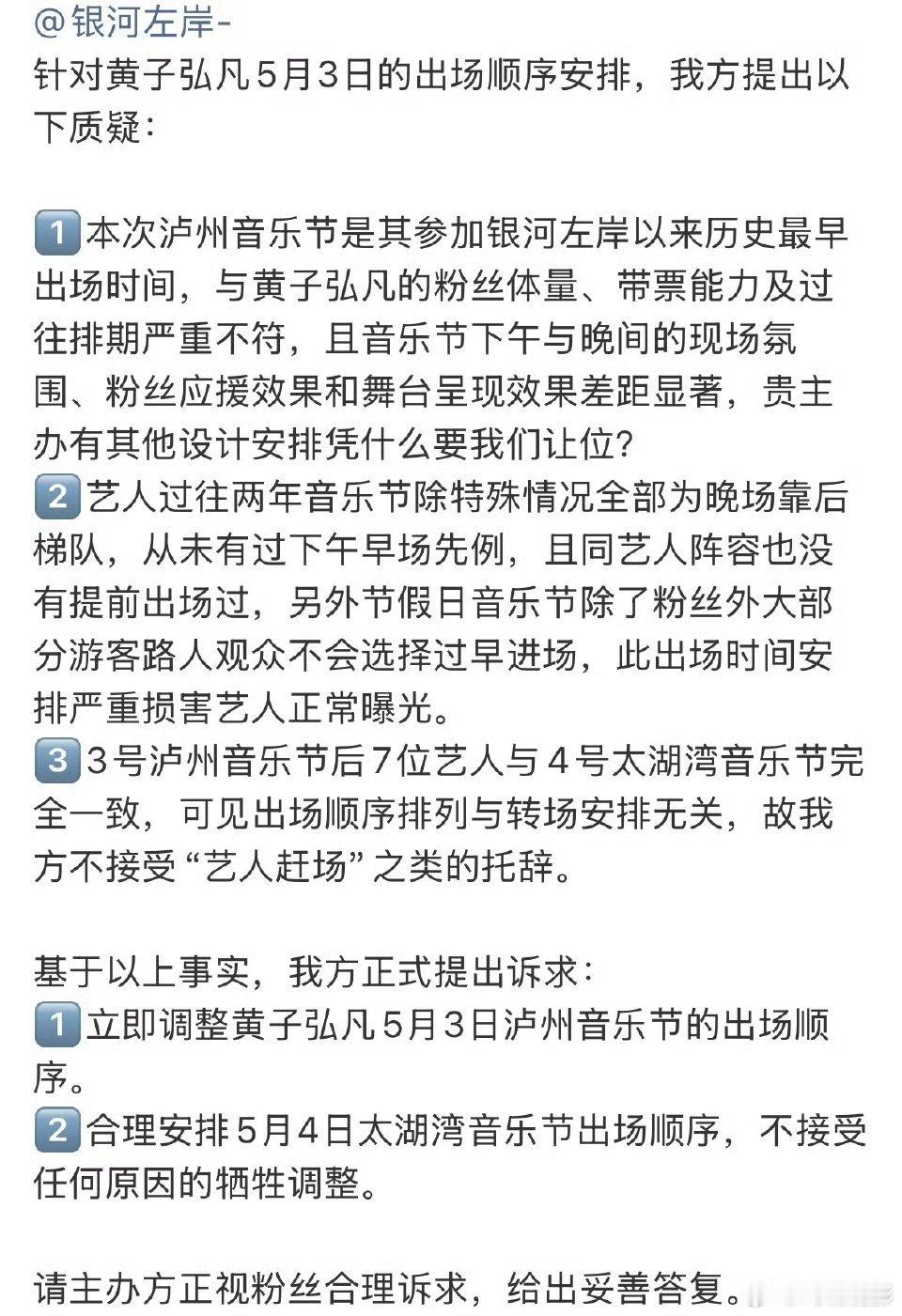 黄子弘凡粉丝还是很厉害!黄子弘凡粉丝已经在维权了,他们认为银河左岸出场顺序安排不合理。大家都知道,他的出场费很高,而且还是这一场参加的的人中唯一一个在鸟巢二连开溢价的歌手 。所以觉得不合理。