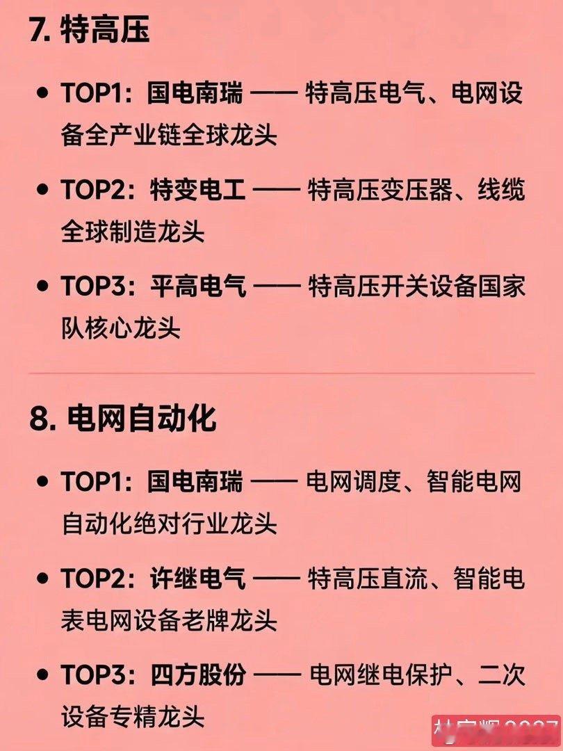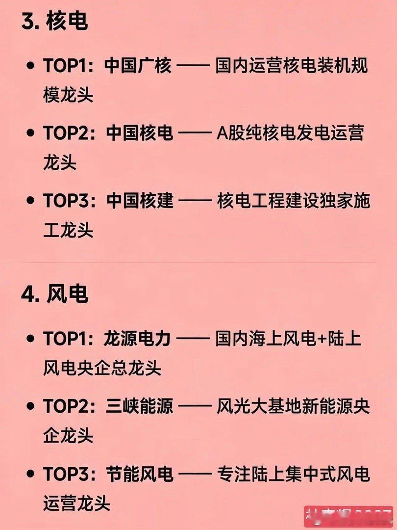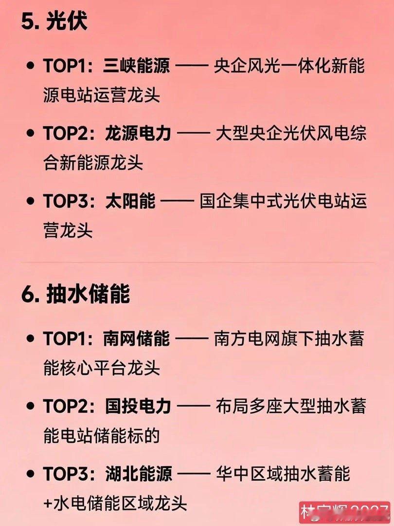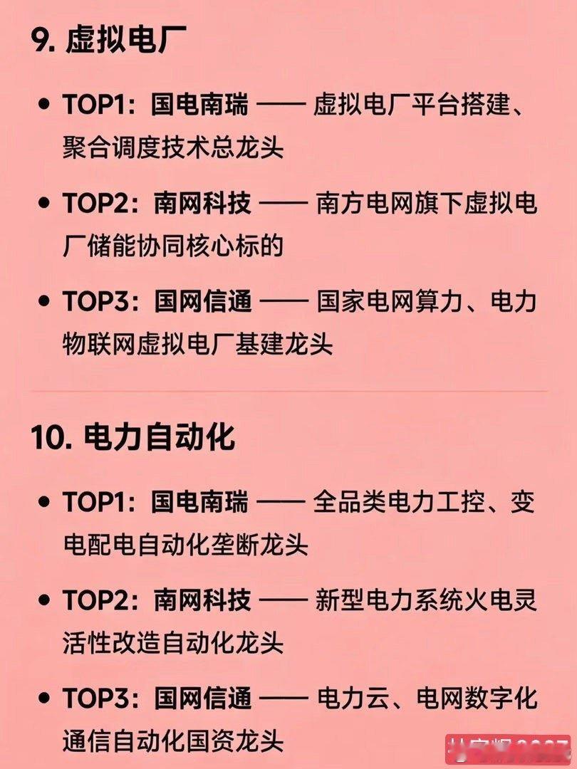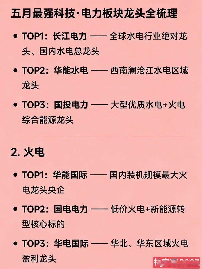 五月电力板块最强龙头全梳理,建议收藏研究!!1、水电TOP1:长江电力——全球水电行业绝对龙头、国内水电总龙头TOP2:华能水电——西南澜沧江水电区域龙头TOP3:国投电力——大型优质水电+火电综合能源龙头2、火电TOP1:华能国际——国内装机规模最大火电龙头央企TOP2:国电电力——低价火电+新能源转型核心标的TOP3:华电国际——华北、华东区域火电盈利龙头3、核电TOP1:中国广核——国内运营核电装机规模龙头TOP2:中国核电——A股纯核电发电运营龙头TOP3:中国核建——核电工程建设独家施工龙头4、风电TOP1:龙源电力——国内海上风电+陆上风电央企总龙头TOP2:三峡能源——风光大基地新能源央企龙头TOP3:节能风电——专注陆上集中式风电运营龙头5、光伏TOP1:三峡能源——央企风光一体化新能源电站运营龙头TOP2:龙源电力——大型央企光伏风电综合新能源龙头TOP3:太阳能——国企集中式光伏电站运营龙头6、抽水储能TOP1:南网储能——南方电网旗下抽水蓄能核心平台龙头TOP2:国投电力——布局多座大型抽水蓄能电站储能标的TOP3:湖北能源——华中区域抽水蓄能+水电储能区域龙头7、特高压TOP1:国电南瑞——特高压电气、电网设备全产业链全球龙头TOP2:特变电工——特高压变压器、线缆全球制造龙头TOP3:平高电气——特高压开关设备国家队核心龙头8、电网自动化TOP1:国电南瑞——电网调度、智能电网自动化绝对行业龙头TOP2:许继电气——特高压直流、智能电表电网设备老牌龙头TOP3:四方股份——电网继电保护、二次设备专精龙头9、虚拟电厂TOP1:国电南瑞——虚拟电厂平台搭建、聚合调度技术总龙头TOP2:南网科技——南方电网旗下虚拟电厂储能协同核心标的TOP3:国网信通——国家电网算力、电力物联网虚拟电厂基建龙头10、电力自动化TOP1:国电南瑞——全品类电力工控、变电配电自动化垄断龙头TOP2:南网科技——新型电力系统火电灵活性改造自动化龙头TOP3:国网信通——电力云、电网数字化通信自动化国资龙头免责声明:发文涉及资讯图等内容来自网络公共信息。仅供科普,不构成任何依据。
