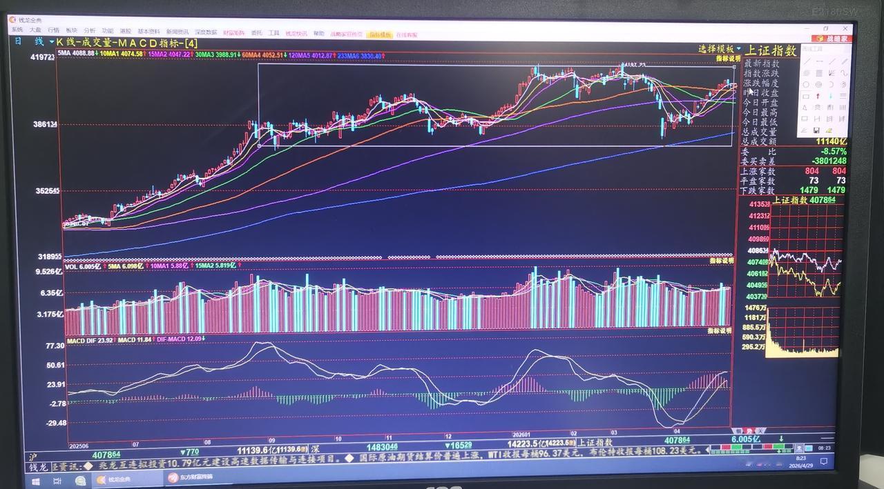 老手说股:(1) 家人们,昨晚欧美股市普遍下跌,新加坡A50微绿,香港恒生期指上涨。 今天开盘的日本和韩国股市下跌。 原油下跌,仍在95至100之间波动。 外围股市是在历史新高的基础上小幅度回撤,可是大A还没有回到前高附近就遇阻停滞不前,外加五一长假因素,资金做多欲望不强烈,前节还余2个交易日,要降低预期。 2026年前4个月,大盘仍是大箱体3800至4200的宽幅震荡走势,这种走势大概率还要持续数月,也就是说5月份走出趋势性上涨的可能性也并不大,相反要注意涨高后回调风险。[玫瑰][烟花]