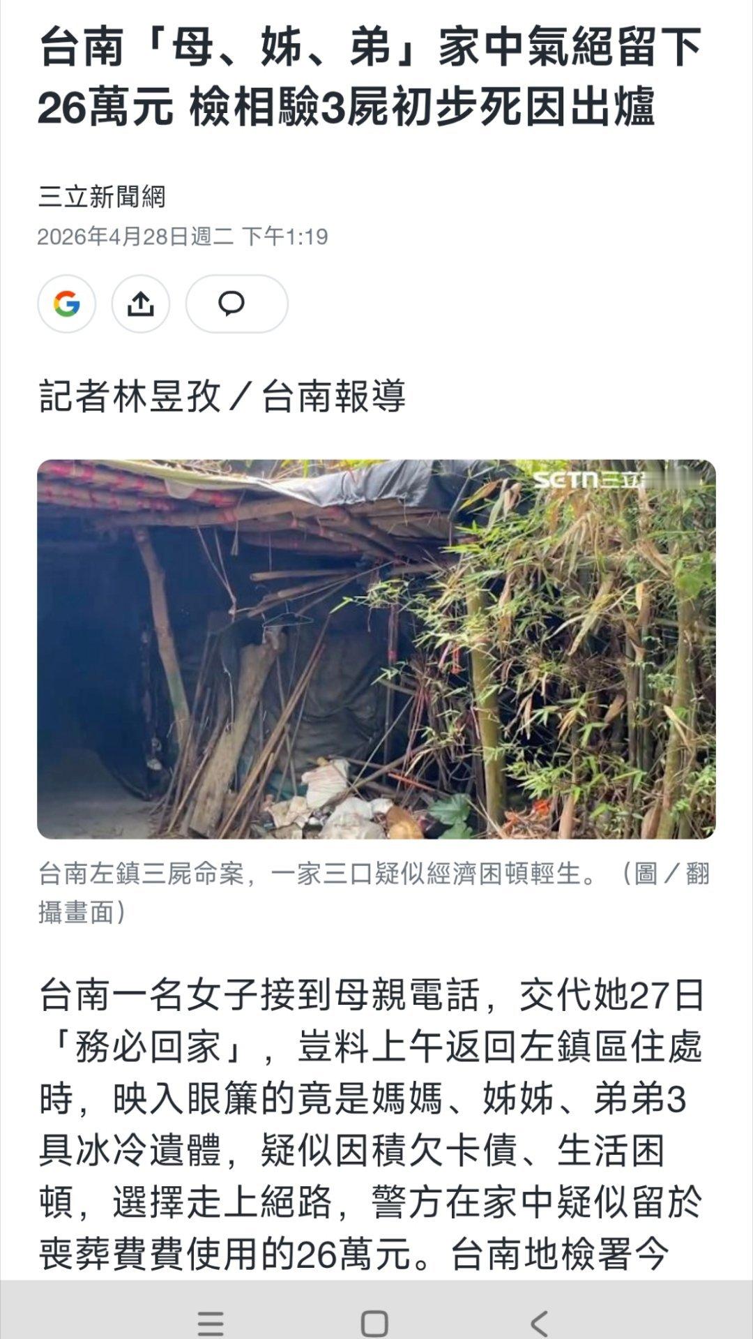 ² 只有一个二女儿嫁为人妇,26号突然接到妈妈(59岁)电话,让她第二天“务必回家”一趟。27号二女儿回到家,发现妈妈、姐姐(40岁)、弟弟(34岁)已经集体自杀,死于服毒。房间里还有姐姐写的遗书,还有26万新台币(5.6万人民币),让二女儿给三个人办丧事用。