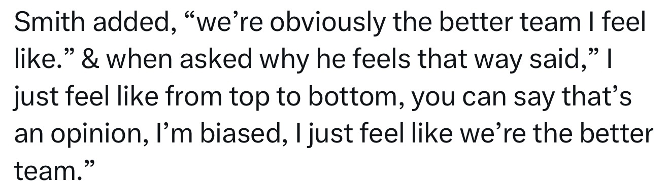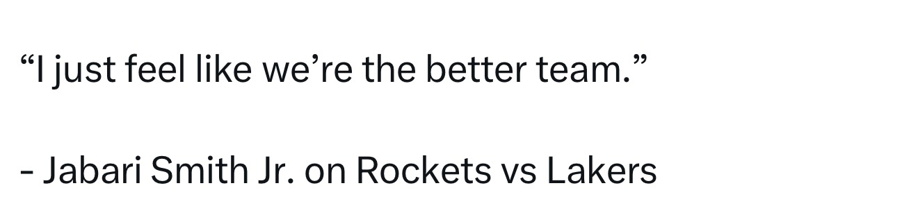 小贾巴里·史密斯今天谈湖人:“我认为我们是更强的那支球队。我只是觉得从首发到替补,你可以说这是我的个人看法,我带有偏见,但我就是觉得我们是更好的球队。”