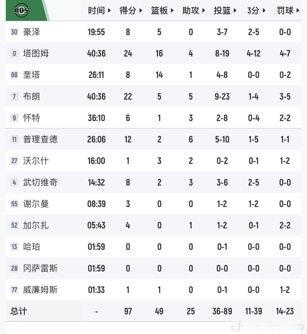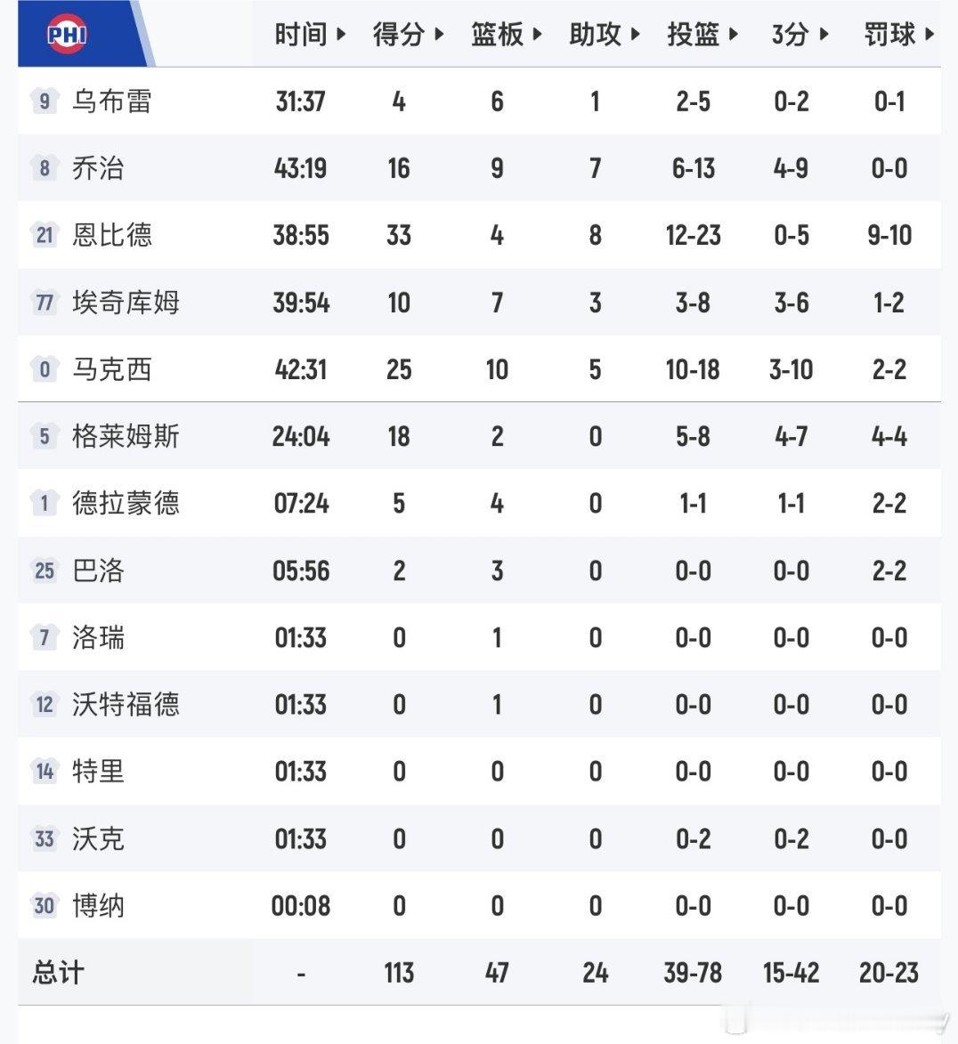 恩比德33分4篮板8助攻,马克西25分10篮板5助攻塔图姆24分15篮板4助攻,布朗22分5篮板5助攻