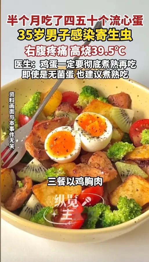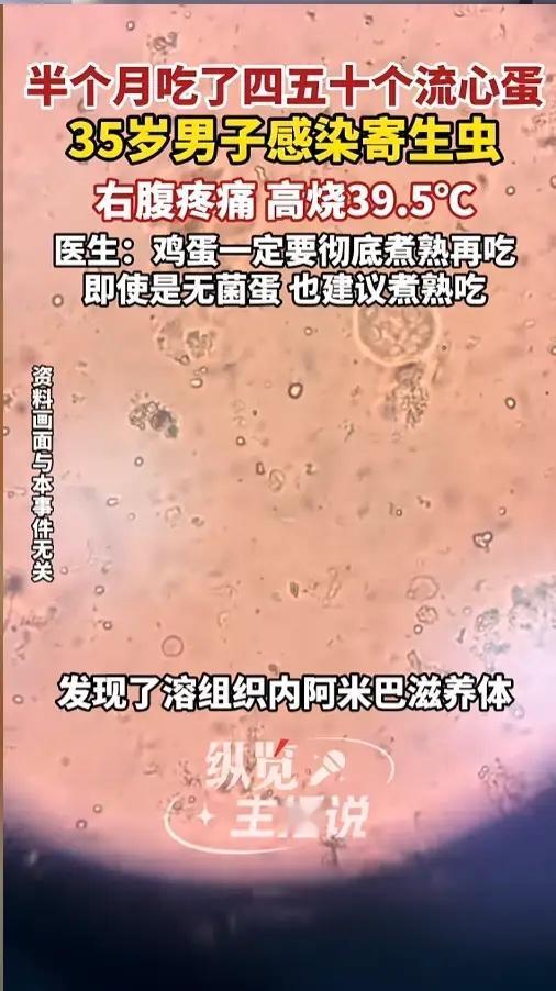“悲剧还是发生了!”4月27日报道,浙江,一男子为保持身材,对自己的饮食十分严苛,每日只吃些鸡胸肉、鸡蛋等。他嫌鸡蛋口味清淡,就做成了流心蛋吃,不成想一段时间后,他的肝竟然长了脓肿!网友:老老实实煮透了再吃吧! 三十五岁的金先生,对自己的身材管理向来格外严格,为了练出紧致有型的好身材,平日里对饮食半点不马虎,常年坚持吃健身餐。每天的餐食翻来覆去就是水煮鸡胸肉、水煮西兰花,鸡蛋更是他每日必不可少的蛋白质来源。 可天天吃全熟的白煮蛋,时间一长金先生彻底吃腻了,干巴巴的蛋黄还特别噎人,吃起来毫无口感。一次偶然的机会,他尝试了流心蛋,半凝固的蛋黄嫩滑爽口,一下子就戳中了他的喜好,他当即觉得这是两全其美的选择,既能补充蛋白质,又能让饮食不再单调。 从那之后,金先生就彻底迷上了流心蛋,隔三差五就煮上一锅,每天都要吃三四个,要么当加餐,要么直接当零食吃。短短半个月时间,他吃下的流心蛋少说也有四五十个,他一直觉得这样吃既健康又美味,丝毫没意识到危险正在悄悄靠近。 没过多久,金先生的身体就亮起了红灯。他突然开始发高烧,体温一路飙升到快40度,同时右侧肋骨下方传来阵阵剧痛,疼得他连腰都直不起来,整个人精神萎靡,短短几天时间就瘦了一大圈,整个人直接脱了相。 起初金先生还想硬扛过去,可身体的不适感越来越强烈,实在撑不住后,才在家人的陪同下前往浙江东阳市人民医院就诊。经过CT检查,医生当场发现他的肝脏右叶长出了一个鸡蛋大小的脓包,初步诊断为细菌性肝脓肿,需要立刻住院进行穿刺引流,同时配合抗生素治疗。 可让人意外的是,即便抽出了脓液,也按时使用了抗生素,金先生的高烧依旧反反复复,始终无法消退。经验丰富的主管医生立刻察觉到不对劲,普通的细菌感染,经过规范治疗后绝不会如此顽固。 于是医生再次找到金先生,仔仔细细询问他近期的饮食,有没有吃过什么特殊的食物。金先生思索许久,除了日常的健身餐,并没有吃别的奇怪东西,唯独想起自己这段时间吃了大量半生不熟的流心蛋。 说者无心,听者有意,医生立刻意识到问题可能就出在这些流心蛋上,马上对抽取的脓液进行特殊病原体检测。最终在显微镜下,找到了致病的元凶——溶组织内阿米巴滋养体,这是一种危害性极强的寄生原虫。 医生解释,这种阿米巴原虫的包囊,很容易污染鸡蛋壳表面,平时清洗鸡蛋很难彻底清除,如果鸡蛋没有完全煮熟煮透,包囊就会随着食物进入人体。进入肠道后,包囊会孵化成滋养体,随后穿透肠壁进入血管,顺着血液流动一路抵达肝脏。 肝脏内营养充足,恰好成为这些寄生虫繁殖的温床,它们在肝脏内不断破坏肝组织,导致组织液化坏死,最终就形成了让人痛苦又危险的肝脓肿,这种病症在医学上被称为阿米巴性肝脓肿。虽说这类病症如今发病率不高,但一旦患病,治疗起来十分棘手,对身体伤害极大。 金先生得知病因后,既后悔又后怕,他怎么也想不到,自己精心搭配的健康健身餐,偏偏在吃鸡蛋这个小细节上栽了大跟头。他一直以为流心蛋只是口感不同,营养保留更完整,却完全忽略了半生不熟食物带来的食品安全风险。 其实生活中,很多人都和金先生一样,为了追求鲜嫩的口感,喜欢吃溏心蛋、半熟肉类,觉得这样更有营养。可事实上,鸡蛋、肉类等食材,本身容易携带沙门氏菌、寄生虫卵等有害微生物,只有经过彻底加热煮熟,才能将这些看不见的病菌和寄生虫完全杀灭。 追求健康身材、自律生活本身没错,但千万不能走进饮食误区,别为了一时的口感,拿自己的身体健康去冒险。很多时候,看似普通的全熟烹饪方式,反而是对身体最安全、最负责的保护。健康饮食的第一步,永远是把食物彻底煮熟,千万别抱有侥幸心理! 各位读者你们怎么看?平时吃鸡蛋会选择全熟还是流心蛋?欢迎在评论区讨论。