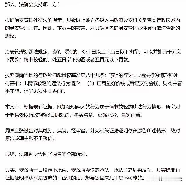 湖南酒店违法交易案:喊冤不举证,索赔终落空 湖南男子肖某酒店寂寞,联系足浴店女技师周某,以700元达成不正当关系交易,二人被当场抓获,均被处3日行政拘留 。周某出狱后喊冤,称审讯遭殴打、被迫认罪,邀肖某作证,索赔20万元并请求撤销处罚 。法院经审查,调取监控与审讯视频,未发现殴打证据,认定处罚程序合法、量处得当,驳回其全部诉请 。 违法事实清晰,处罚有据可依 - 交易事实明确:肖某与周某通过微信联络,谈妥价格并完成支付,形成卖淫嫖娼交易,符合《治安管理处罚法》第六十六条认定标准 。 - 程序合法合规:办案人员经前期蹲点排查、收网处置,事实清楚、证据确凿,裁量时结合情节较轻情形,作出3日拘留,符合当地执法规范 。 - 法律适用准确:依据《治安管理处罚法》第六十六条,卖淫嫖娼可处10-15日拘留或5000元以下罚款,情节较轻可减轻处罚,本案处罚幅度合理。 喊冤无据,索赔难获支持 - 举证责任倒置:行政诉讼中,被告对行政行为合法性负举证责任;周某主张遭殴打、被迫认罪,需提供有效证据,其仅靠口头与单方证言,未提交监控、伤情鉴定等实质证据,无法推翻处罚决定 。 - 证据审查结果:法院调取审讯全程视频,未发现执法人员存在殴打等违法情形,肖某的证言亦无其他证据佐证,未被采信 。 - 赔偿主张落空:周某主张20万元赔偿,需证明损害事实与执法行为存在因果关系,其未提供伤情鉴定、医疗记录等材料,赔偿请求缺乏依据,依法驳回。 本案启示 - 违法必受惩:卖淫嫖娼属违法行为,无论是否发生关系,只要达成合意、完成支付,即应受罚,侥幸逃避难成功。 - 举证是关键:行政复议或诉讼中,主张违法者需提供有效证据,无证据或证据不足,诉求难以成立 。 - 执法要规范:执法机关应严格依规办案,留存完整视频、记录等证据,避免争议;当事人也应理性维权,切勿无中生有、虚假索赔 。 本案中,周某认罪后又翻案索赔,因缺乏实质证据,最终未能改变处罚结果,凸显了“以事实为依据、以法律为准绳”的司法原则。