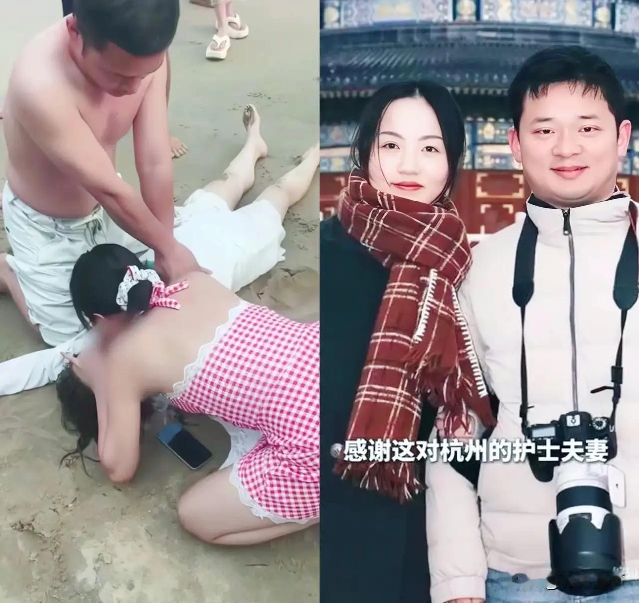 找到了!找到了!海南万宁沙滩上,为溺水女子做心脏复苏和人工呼吸的护师夫妻找到啦!丈夫是来自浙大一院余杭院区急诊监护室的主管护师姜智文,妻子是来自浙大一院余杭院区综合监护室的护师袁苑。 4月26日傍晚6点多,海南万宁神州半岛的沙滩上,夕阳正在把海面染成金色。 本该是一场浪漫的追日之旅,却被一声突如其来的呼救打断了。姜智文和袁苑正在散步,忽然看见远处几个人正吃力地抬着一名浑身湿透的女子往岸上拖。没有犹豫,甚至没有说话,夫妻俩几乎同时向出事点奔去。 跑到跟前,情况比想象的更糟:溺水女子面色青紫,口吐白沫,意识全无。 姜智文俯身探向女子的颈动脉,那根最能感知生命信号的血管此刻死寂一片。“快打120!”话音未落,他已经在粗粝的沙滩上跪了下来,双手交叠,开始了第一轮胸外按压。 这是在和死神抢时间,每一秒都像被拉长了无数倍。 随着姜智文一次又一次精准有力的按压,妻子袁苑默契地跪在另一侧。没有纱布,没有隔离物,她毫不在意地直接俯身,一手托起溺水女子的下颌,一手捏紧鼻子,深吸一口气,口对口用力吹气。 一个按压,一个通气;再按压,再通气。周围的游客焦急地等待着,海浪声、风声夹杂着紧张的呼吸声,时间仿佛凝固了。 18点11分,距离开始抢救仅仅过去4分钟。“有了!” 姜智文的手再次搭上患者的颈动脉,那根死寂的血管终于传回一丝微弱的跳动。一声短促的呛咳,女子的胸廓也开始有了自主起伏。 直到120的担架冲进人群,夫妻俩才稍稍松了口气。他们没有急着站起来,而是向家属叮嘱记住施救过程的关键节点,交代后续治疗注意事项。 人群散去,姜智文这才发现,自己的膝盖在方才的跪姿中早已磨破了皮,沙子嵌在伤口里混着血迹。他看着身旁的妻子,笑了:“本来想陪你追日落的,结果没看成,倒是救回了一条命,也挺值的。” 而在那个争分夺秒的急救现场,除了专业的夫妻俩,还有一群无名英雄同样值得掌声。 据当地村民崔经络回忆,当时他发现一名女子在海里游泳时突然没了动静,观察片刻后,他当即与同村三人跳入海中,拼尽全力将人托举到岸上。正如网友所言,如果再晚一分钟,后果不堪设想。 4分钟,不仅是一个时间长度,更是一个生命奇迹的跨度。 这短短的4分钟,是姜智文和袁苑夫妻俩脱下白大褂后依然保持的职业惯性;是他们日复一日在监护室高压工作下磨练出的临危不乱;更是一个医务工作者对“救死扶伤”这四个字最本能的坚守。 姜智文事后说,在浙大一院,每个人都要掌握急救技能,而且任意两个人配合起来,也都必须是严丝合缝的。 是同事,是夫妻,更是战场上背靠背的战友。 看惯了生死的人,往往更敬畏生命。在那一刻,他们用膝盖撑起了生命最后的防线,用一声声“用力按压”对抗着死神的侵袭。 没看到日落,却看到了一次生命的重启。 麻烦看官老爷们右上角点击一下“关注”,既方便您进行讨论和分享,又能给您带来不一样的参与感,感谢您的支持!