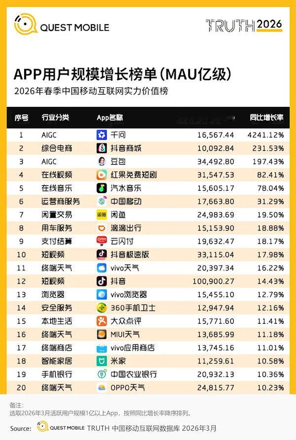 报告数据显示,截至2026年3月,抖音MAU达到100900.27万,也就是超10亿,是国内首个月活破10亿的短视频平台。也是国内第二款月活破10亿的APP。