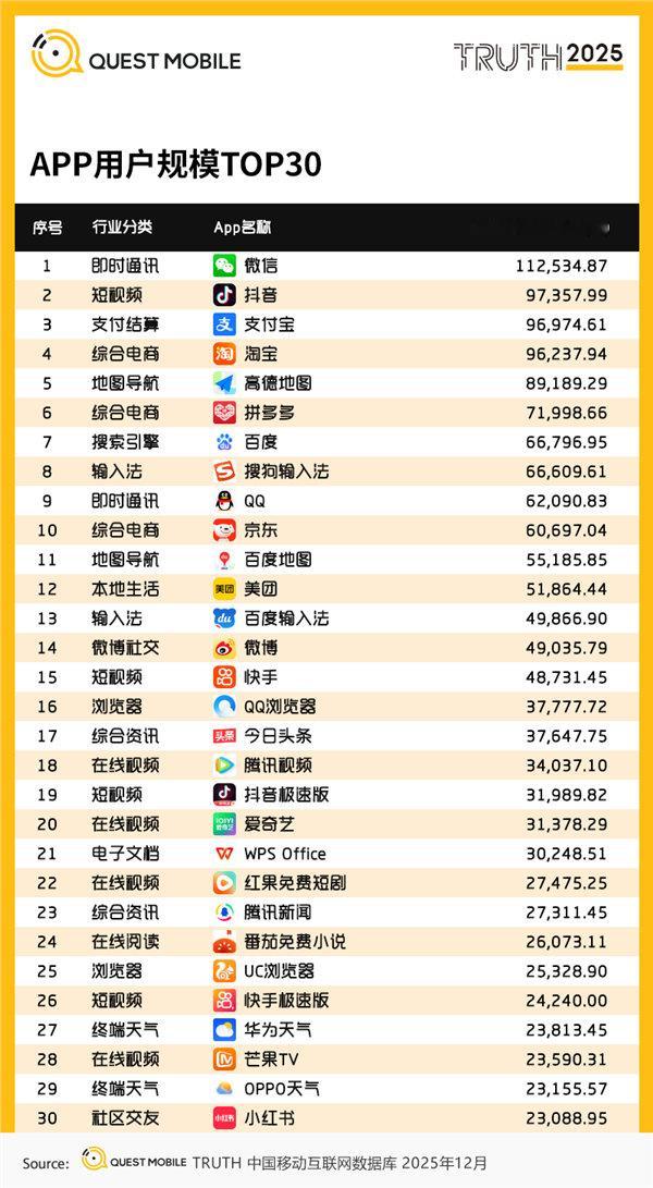 同时,抖音极速版月活也达到3.3亿,同比增长17.98%,两个平台合计覆盖了国内绝大多数移动互联网用户。QuestMobile此前发布的中国移动互联网APP用户规模TOP30榜单显示,截止2025年12月,微信是唯一月活破10亿的APP,当时抖音月活9.73亿。