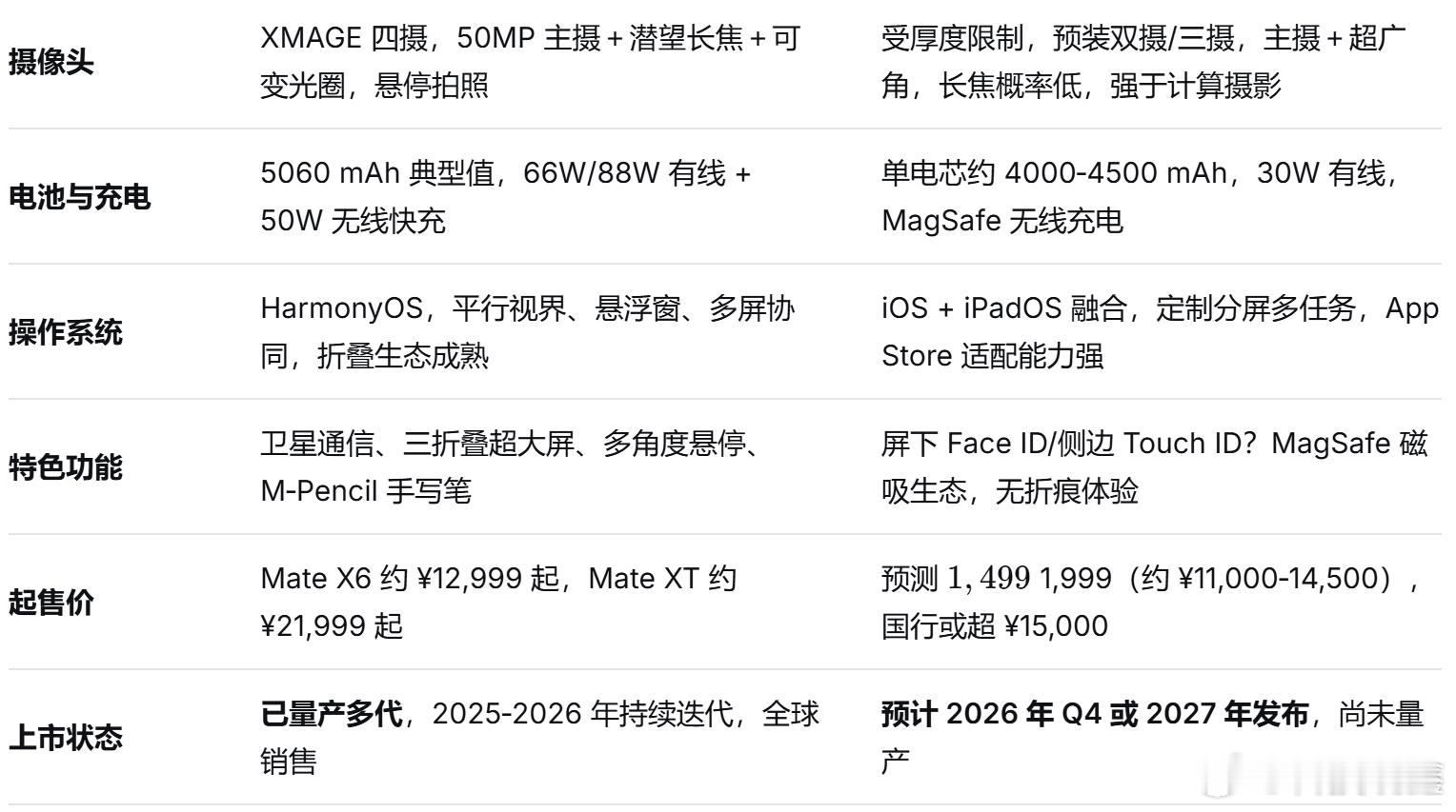 苹果尚未发布折叠屏手机,华为信息基于已量产机型,iPhone折叠屏部分根据彭博社、郭明錤、海通国际等爆料与专利预测,华为折叠屏对比iphone折叠屏 仅供参考(如图)总体而言:华为折叠屏形态丰富、迭代成熟,在影像、快充、卫星通信等方面形成差异化优势;苹果首款折叠机可能走稳健路线,集中攻克无折痕屏幕与大屏 iOS 生态,定价预计仍走超高端路线。