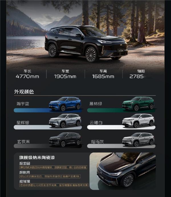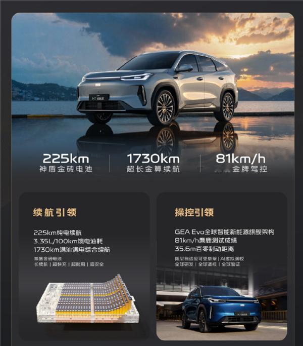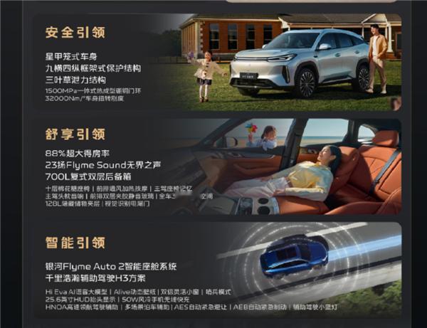 超长续航:全系标配225km纯电续航(CLTC),综合续航达1730km;搭载29.8kWh神盾金砖电池,30%-80%快充仅15分钟,WLTC馈电油耗4.69–4.73L/100km;动力性能:1.5L雷神EM混动(热效率47.26%)+175kW电机,零百加速7.7秒,通过81km/h麋鹿测试;空间实用:车长4770mm,轴距2785mm,得房率88%,后备箱700L(放倒后排扩至1990L),另含128L隐藏储物夹层;豪华座舱:82%软包覆盖 + 23扬声器Flyme Sound(2000W功放,7.1.4全景声)+ 15.4英寸2.5K中控屏 + 7nm龍鹰一号芯片;全域安全:星甲笼式车身,乘员舱100%高强钢,1500MPa一体式硼钢门环,整车扭转刚度32000Nm/°;智能驾驶:全系标配千里浩瀚H3智驾,支持高速NOA、自动变道/上下匝道及300+种车位自动泊车。