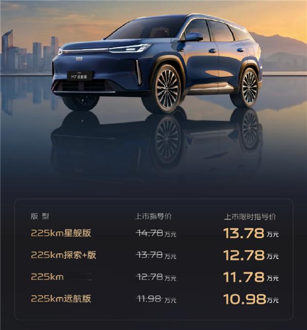 吉利银河M7远航家正式上市,限时价10.98–13.78万元,主打高续航、高安全与高智能: