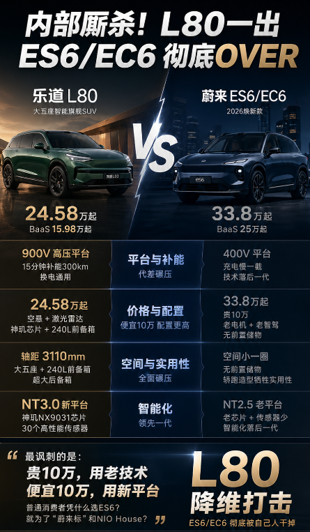这波真的有点狠,乐道L80不是来补位的,是来“动刀”的。 同门对打最致命:一边是900V新平台、15分钟补300km、空间大到离谱,还给你前备箱;另一边ES6/EC6还在400V慢充+老平台打转。关键是价格——便宜将近10万,配置反而更猛。 说白了,这不是竞品竞争,是“新体系清库存”。 你让普通用户怎么选?情怀还是实用?标还是技术? 我判断:ES6/EC6短期销量压力会非常大,不换代很难翻身。