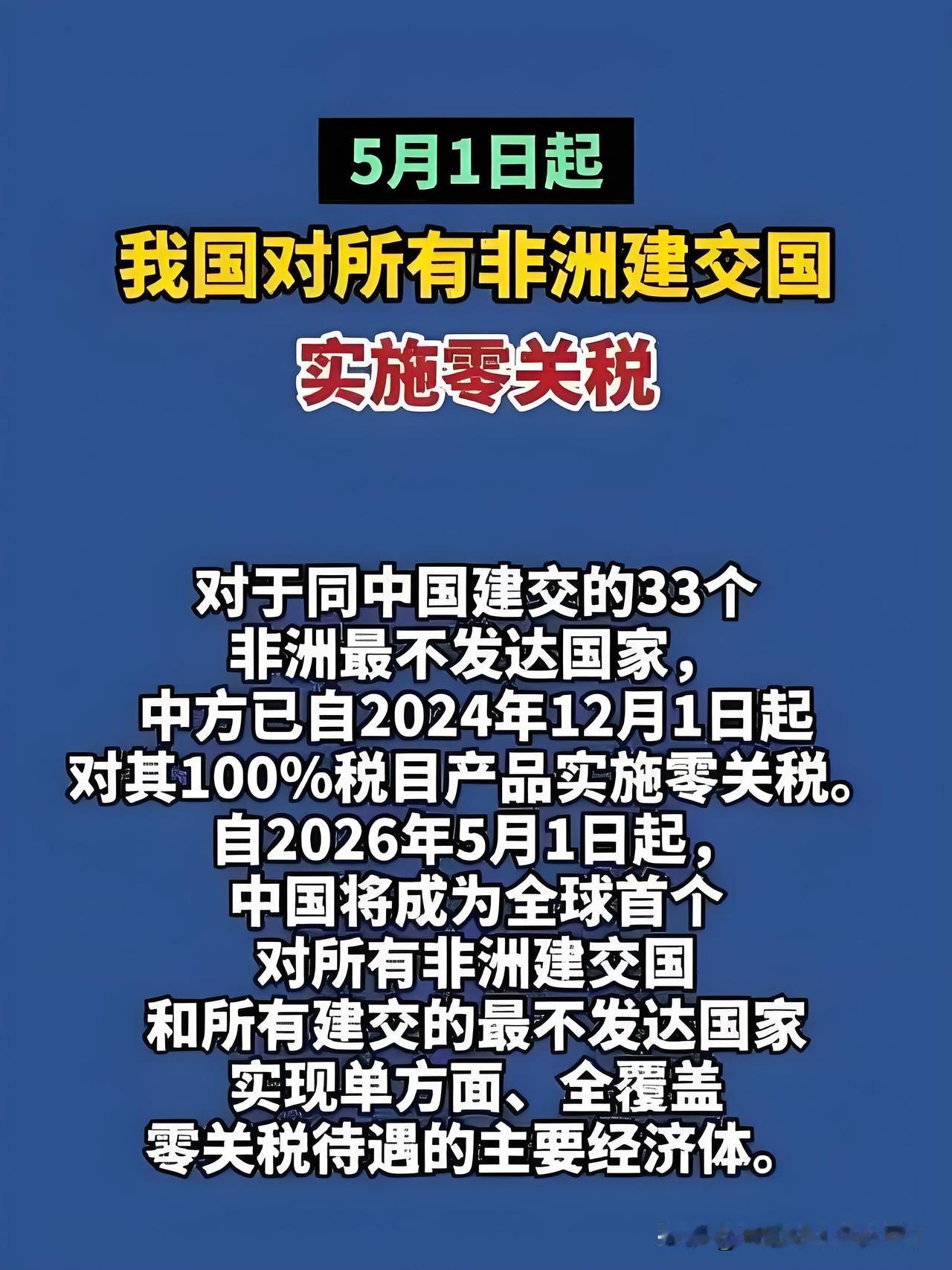 中国单方面宣布! 给非洲53国送上零关税大礼! 2026年5月1日起,对非洲全部53个建交国,实施100%税目零关税! 中国已经连续17年是非洲最大贸易伙伴,今年一季度中非贸易额就飙到6465.6亿元,同比大涨23.7%!零关税一落地,非洲的咖啡豆、红酒、坚果、精油,这些曾被关税挡住的好物,都能以更低价格走进中国家庭;而非洲的农民、工人,也能靠着14亿人的大市场,拿到实实在在的收入。 这不是简单的贸易优惠,是中国用实际行动,给全球南方合作打了个样!这份单方面的善意,直接让中非友谊再上一个台阶!