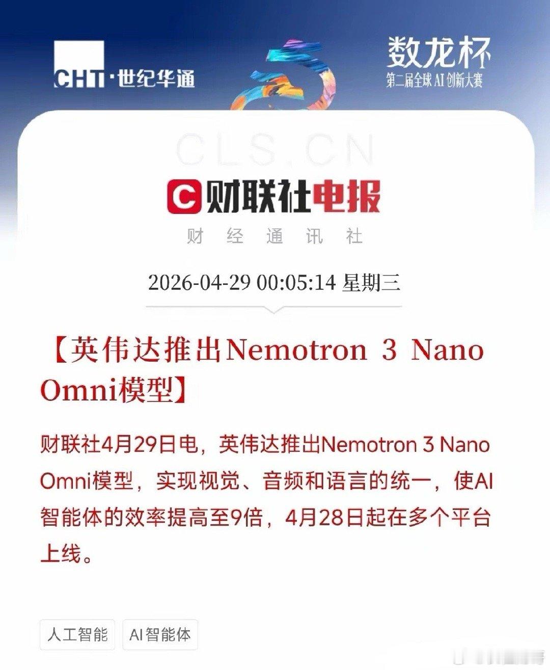 深夜王炸!英伟达放出一张全模态核弹,AI智能体效率提升9倍凌晨,黄仁勋又搞突袭了。英伟达正式推出Nemotron 3 Nano Omni模型,在业内首次实现了视觉、音频和语言的真正统一。AI智能体效率瞬间跃升9倍——不是纸面跑分,而是实实在在的吞吐量大涨。富士康、Palantir直接第一时间抢用。戴尔、甲骨文、DocuSign等一大票科技巨头集体进入评测。这已经不是在追热点了,这是在疯狂抢船票。如果还是简单地把它当成一次普通的新版AI发布会来看,那可能就要错过后市那场最大底牌的游戏规则改变了。拆开这颗核弹的内部设计。