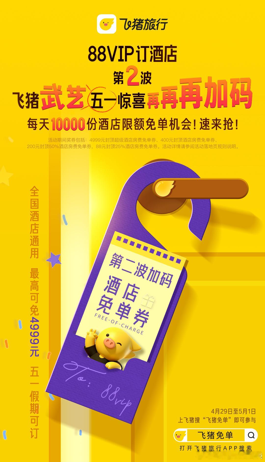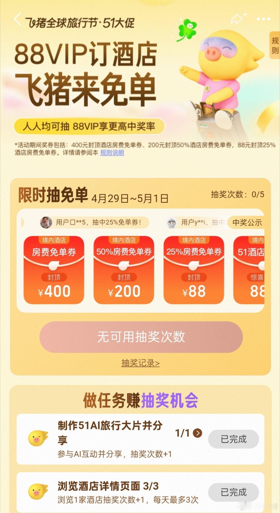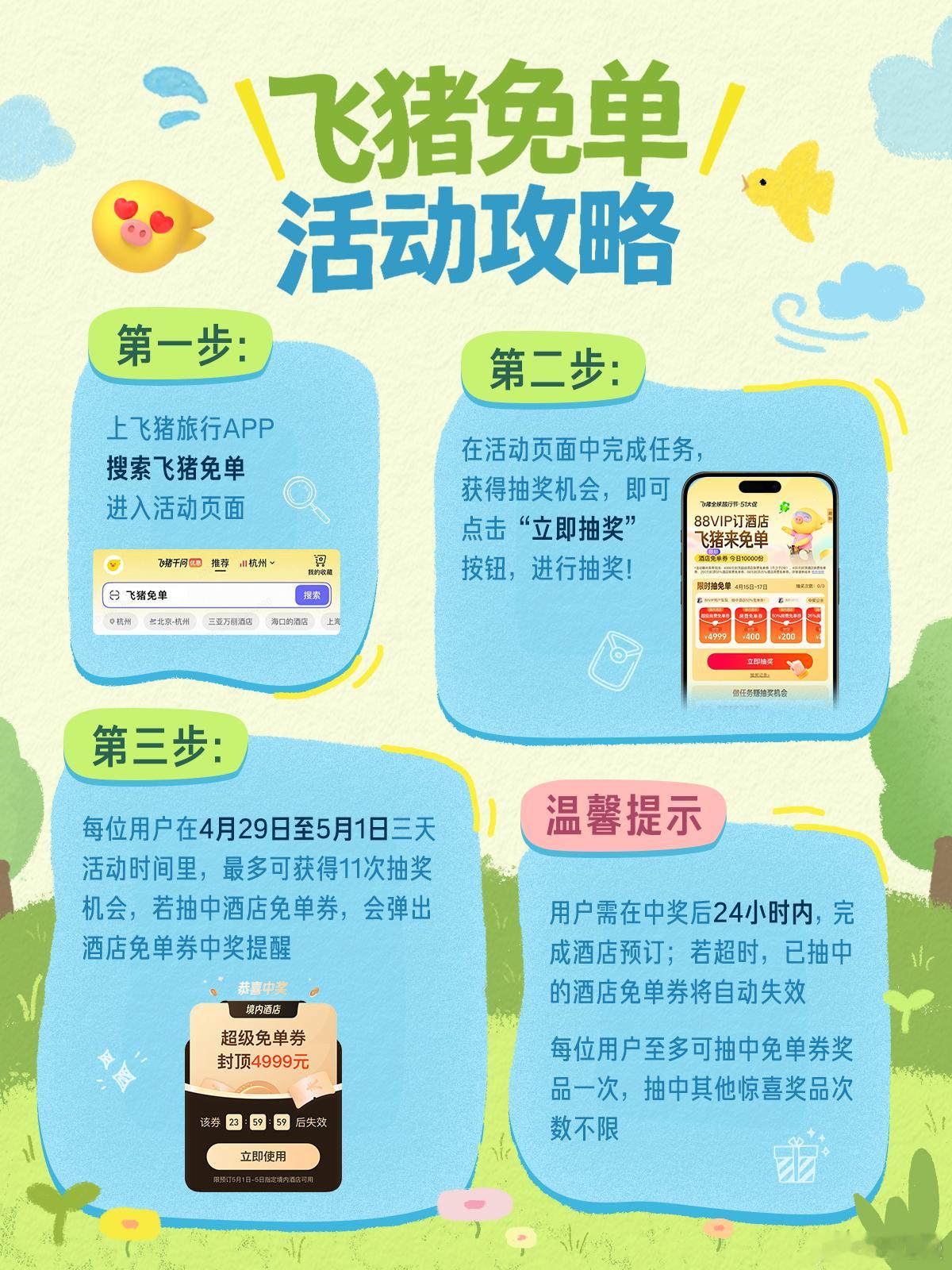 飞猪免单活动攻略马上就是五一小长假了,想必不少朋友都规划好旅游路线了吧出门游玩,机酒是开销大头。想给旅行预算“瘦身”的,可别再错过飞猪免单活动了。第二波加码回归!4.29-5.1连开三天,先抽后订,没中奖不亏,中了直接省大钱 。每天都能抽,三天共11次机会。操作也简单,打开APP搜索关键词飞猪免单就能参与,不用先下单,抽中再决定订不订,完全没风险,运气好还能抽中免单券。