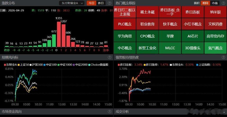 上午市场整体呈现低开高走,几大主要指数悉数由绿翻红,在经历短暂惯性下探后迅速企稳回升,多头反击意愿明显增强。微盘股指数强势领涨,涨幅超1%,大小盘指数同步走高,两市上涨家数超过3800家,市场赚钱效应快速回暖,情绪面呈现从冰点向修复的快速切换。