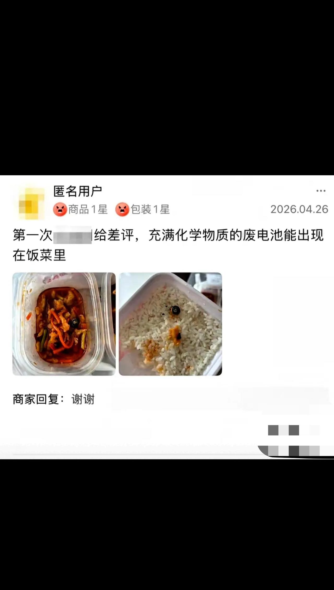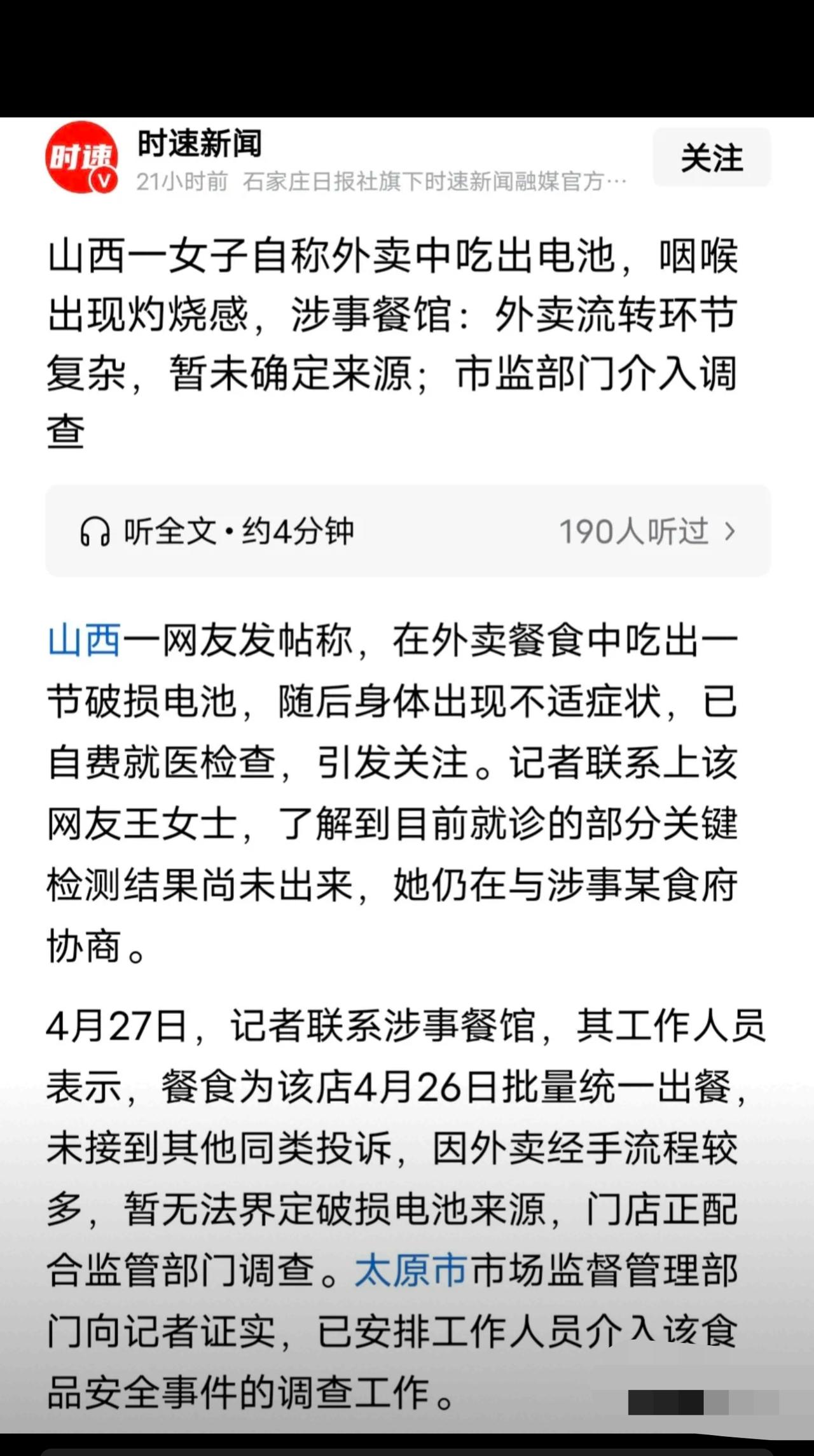 山西太原,女子在一家饭店点了一份外卖,边吃边看综艺,47分钟后,她嘴里吃出硬物,拿出一看是废电池,她赶紧催吐,只觉嗓子有烧灼感,她找商家陪同就医,没想到,商家说:没这个义务、还说可能是外卖员放的。 山西太原的王女士,是一家饭店足足6年的老顾客,这么多年一直认准他家,对菜品卫生百分百放心。4月26号中午,她照常点了这家的外卖,本想边看综艺边干饭,好好放松一下,没想到却遭遇了惊魂时刻。 餐送到后她慢悠悠吃了47分钟,正嚼着饭突然嘴里窜出一股刺鼻怪味,还有硬物狠狠硌牙,赶紧吐出来一看,当场吓得手脚发软——饭菜里居然裹着一节破损漏液的废电池! 电池里的有毒电解液早就混进饭菜里了,王女士又恶心又恐慌,立马拼命自行催吐,生怕重金属毒素伤身,可刚催吐完,嗓子就传来火辣辣的烧灼感,胃里也一直反酸难受。 她念及多年老顾客的情分,压根没提赔偿,只带着餐品上门,希望商家能陪同去医院做检查,就想求一份身体无碍的安心。 可商家的操作简直让人无语!不仅冷冰冰拒绝,直言没有陪同就医的义务,还直接把锅甩给外卖员,咬定是配送环节出的问题,死活不承认自家后厨有疏漏,连负责人的面都不肯见,全程敷衍甩锅,没有一丝歉意! 六年的真心信任,瞬间碎得彻底,王女士又气又寒心,无奈只能投诉维权,自费去医院检查,结果查出指标异常,医生怀疑是代谢性酸中毒,关键的重金属检测结果还得等,这段时间她天天焦虑到失眠,身体不适一直没缓解。 这事一出,网友直接炸锅,评论区吵翻了天,各种观点太真实: ✅网友1:绝对不可能是碰瓷!谁讹人会用废电池啊?又脏又危险,也就是六年老顾客,才会一开始想着好好沟通,商家太没担当! ✅网友2:到底是后厨多脏乱差,才能把电池混进饭菜里?还好意思说没其他顾客投诉,批量出餐不代表卫生没问题! ✅网友3:甩锅外卖员也太过分了!人家就送个餐,凭什么背锅?商家拿流程多当借口,就是不想负责! ✅网友4:做餐饮最基本的就是食品安全,出了事不解决问题,只想着推卸责任,这种店就该严查! ❌也有网友疑惑:电池那么明显,怎么会没注意就吃进去?会不会有其他隐情,但不管怎么说,商家态度都太恶劣! 💬说说我的看法: 做餐饮生意,良心永远是第一位!6年老顾客的信任,是无数次消费积累起来的,比任何宣传都珍贵,可商家一句“没义务”,彻底寒了所有消费者的心。 别拿“外卖环节多”当免责挡箭牌,法律早就明确食品安全首负责任制!你家售出的餐品出了问题,就必须先承担责任,先配合消费者就医维权,至于是不是外卖员的问题,那是商家后续自己去追责的事,跟消费者毫无关系! 消费者要的从来不是刻意刁难,只是一个态度和一份安全保障,商家连最基本的责任感都没有,又怎么配留住顾客? 目前监管部门已经介入调查,真心希望能严查到底,给王女士一个公道,也让所有无良商家明白:餐饮无小事,失了良心、丢了责任,迟早做不下去! 大家吃外卖遇到过最糟心的事是什么?评论区吐槽避坑!👇