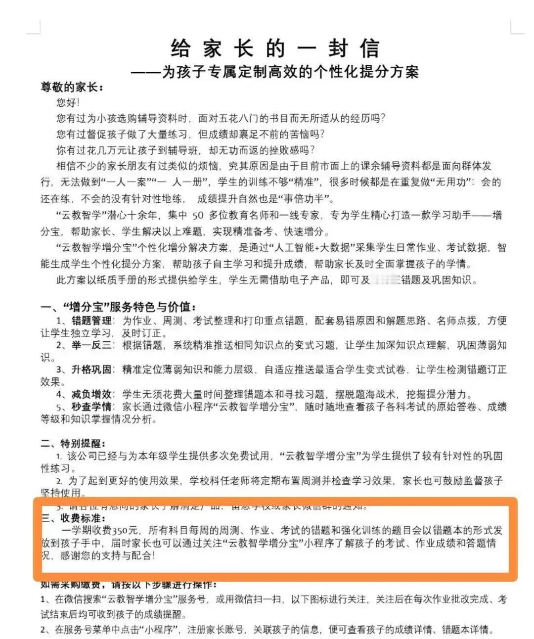 湖南怀化,一女子收到孩子高二班级群通知,让她绑定某学习助手,一学期收350元,如果不绑定,孩子的学习成绩都看不到,女子觉得太过分了,虽然校方说自愿,但老师却一直催她缴费。 据4月29日齐鲁壹点报道,一女子的孩子读高二,到了高考蓄势待发的阶段。 她最近遇上了件闹心的事,孩子的班级群里突然发了通知,要家长绑定一款学习助手,说一学期要交350块钱。 最让女子不能接受的是,如果不绑不交钱,连孩子的考试成绩都看不了。 女子说,学校发了所谓的“给家长的一封信”,把这个学习助手吹得挺厉害。 女子觉得,那些花里胡哨的功能根本用不着,作为家长,她就想知道孩子每次考试考了多少分?作业完成得怎么样? 这点最基本的需求,现在居然要花钱才能实现? 更让女子堵得慌的是,学校口口声声说这个缴费是自愿的,可班主任一直在家长群里催着大家绑定交钱。 班主任还明里暗里提醒,要是不缴费绑定,后面网上阅卷的结果、孩子的成绩都查不到。 说白了,就是把查成绩的功能和这个付费服务绑在了一起,看似自愿,实则是逼着家长不得不掏这笔钱。 这位家长算过账,一学期350块,高中剩下的四个学期下来就是1000多。 要是真能对孩子学习有帮助,也就算了,可自己明明不需要那些额外的分析功能,就想查个成绩,凭啥要为自己用不着的服务买单? 她觉得这个收费完全不合理,也不符合教育部门的相关规定,已经打了服务热线,还向主管部门反映了情况,不过暂时还没收到官方的回复。 其实这事,搁谁身上都得堵得慌,查成绩本来就是家长最基本的知情权。 以前成绩单直接发到手里,顶多老师建个群通知一声,一分钱不用花。 如今倒好,搭上个所谓的“智能学习工具”的壳,就把最基础的功能捆在付费服务里,说穿了就是“要进门先买路”,拿家长的刚需当赚钱的筹码。 说句实在话,真要是产品好用、家长自愿买也就算了。 可偏偏拿“不付费就看不了成绩”来要挟,还口口声声说“自愿”,这跟强买强卖有啥区别? 如今养个孩子本来花销就大,学费、教辅、补课费已经压得不少家庭喘不过气。 这种明摆着的“薅羊毛”,说白了就是吃准了家长不敢得罪学校、不想影响孩子的心态,把生意做到了校园里,把教育当成了牟利的工具。 更值得琢磨的是,学校和这个第三方平台到底是什么关系? 有没有正规的收费审批?要是每个学校都学着这么搞,今天查成绩要花钱,明天看作业要付费,后天改个试卷还要收服务费,那家长的钱包不成了谁都能掏的“唐僧肉”? 这种歪风要是不管,最后损害的不仅是家长的利益,更是学校和教育部门的公信力。 《未成年人保护法》第38条明确规定:学校、幼儿园不得向未成年人及其父母或者其他监护人推销或者要求其购买指定的商品和服务。 学校把查成绩,和付费第三方产品强制绑定,本质上属于变相要求家长购买指定服务,已经触碰了法律红线。 相关收费不仅应当全额退还,涉事学校,及相关责任人也需承担相应的违规责任。 对此,你怎么看?