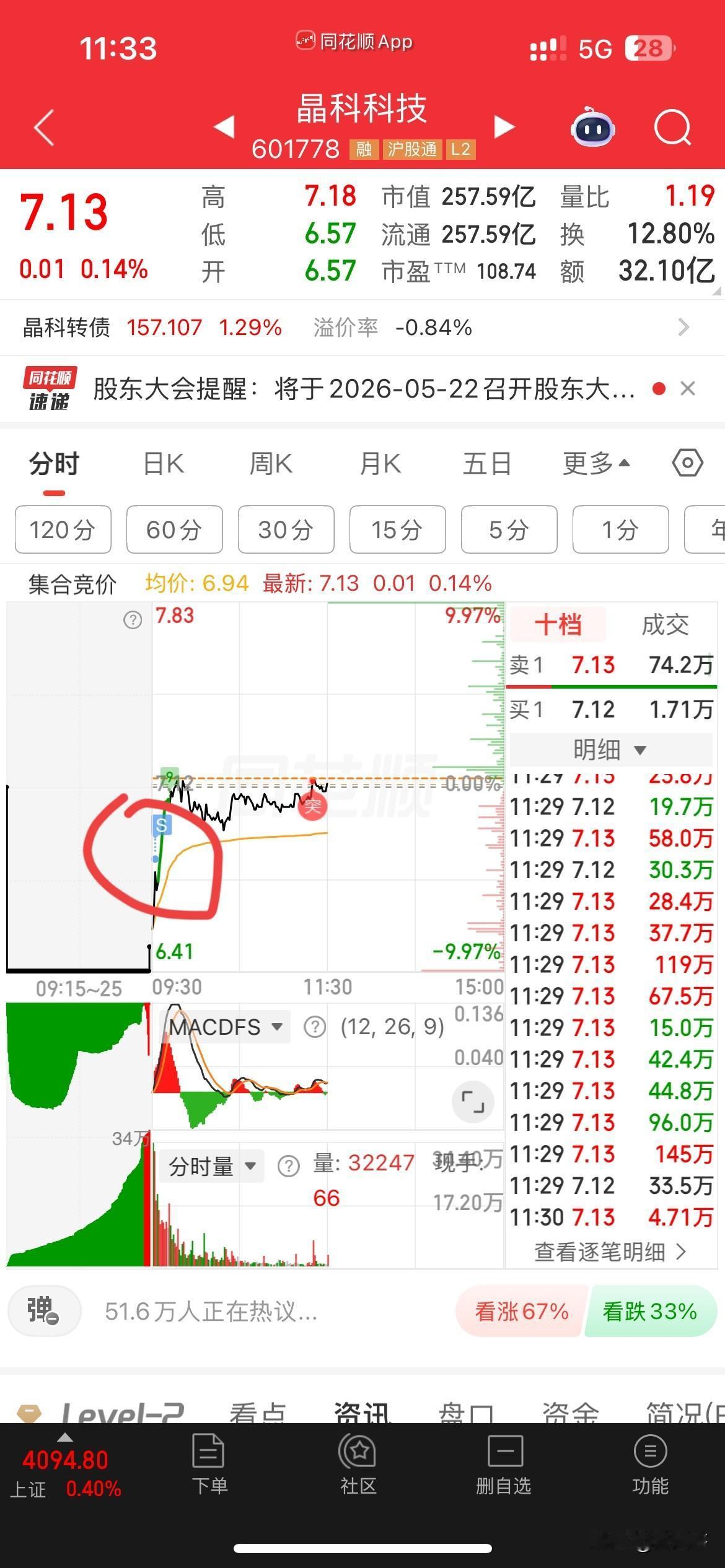 好险呀, 开盘被晶科吓尿了[笑哭][笑哭][笑哭], 早上一看美股大跌, 晶科业绩又拉垮, 水下7个多点开盘, 想着今天是完了, 开盘会晶科上冲, 直接3个多点割了, 没想到,电力一波拉升, 晶科也跟着上来了, 还红盘, 真是太难把握了, 被月底的业绩雷好怕了!