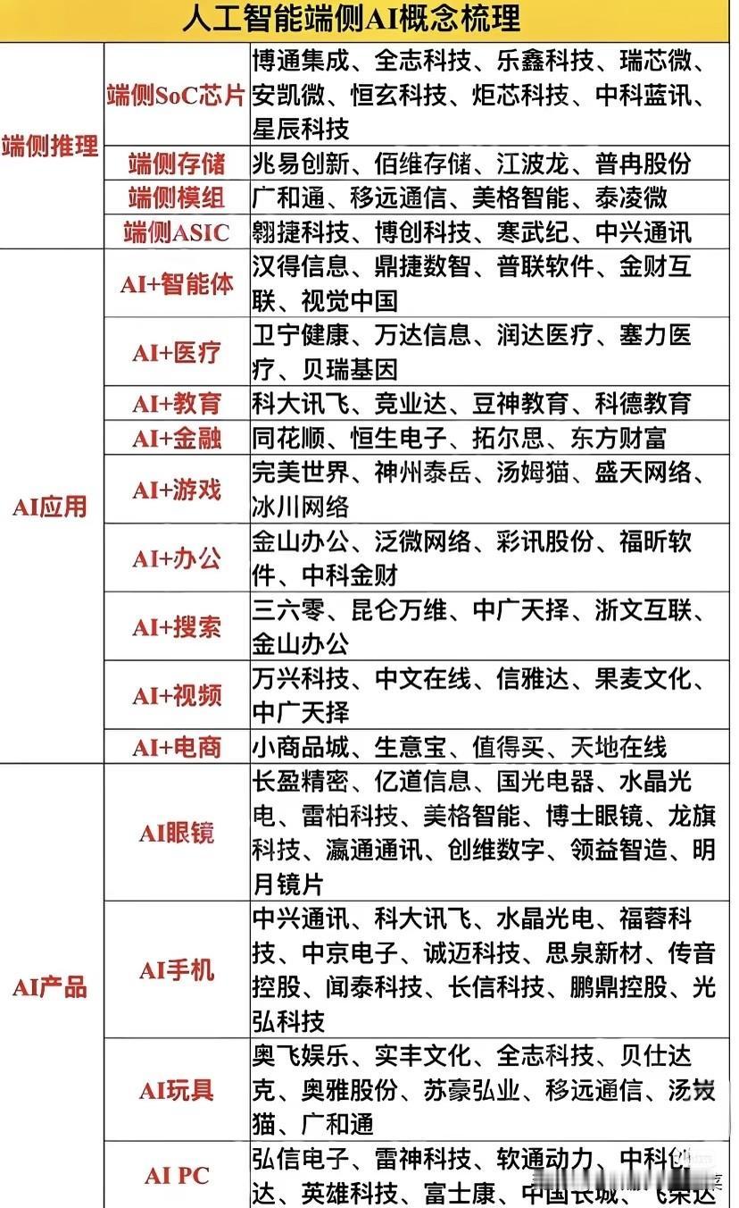 端侧AI爆发前夜:谁在悄悄卡位下一个万亿风口? 当大模型的竞争逐渐进入白热化,一场更贴近用户的革命正在悄然发生——端侧AI,正从概念走向现实,成为下一轮科技产业的核心战场。你有没有想过,未来你的手机、眼镜,甚至玩具,都能在本地独立运行AI大模型? 端侧AI的崛起,本质上是算力下沉的必然结果。从云端到终端,AI推理的重心转移,不仅能大幅降低延迟、保护数据隐私,更能催生出全新的交互场景。这一次,产业链的每一个环节都在抢滩登陆:从端侧SoC芯片的博通集成、全志科技,到存储环节的兆易创新、江波龙,再到模组厂商广和通、移远通信,一场覆盖硬件全链条的军备竞赛早已打响。 硬件的突破,正在为应用层打开无限想象空间。AI+医疗的卫宁健康、AI+教育的科大讯飞、AI+金融的同花顺,早已将端侧能力融入产品生态;而在AI眼镜、AI手机、AI PC等终端产品上,雷柏科技、中兴通讯、雷神科技等玩家,正试图通过硬件创新重构用户体验。以AI眼镜为例,它不仅是消费电子的下一个入口,更是端侧AI技术落地的最佳载体,有望复刻智能手机的成长路径。 这场变革中,中国企业正迎来弯道超车的机会。不同于云端大模型的巨头垄断,端侧AI的竞争更考验硬件适配、场景落地和供应链整合能力。从芯片设计到终端制造,A股公司在产业链各环节的卡位优势,正在转化为实实在在的产品竞争力。 当市场还在为云端算力狂欢时,端侧AI的浪潮已经悄然袭来。它不是对云端的替代,而是一种互补与延伸,更是一场关乎用户体验的底层革命。看懂端侧AI的产业链图谱,才能抓住这场算力下沉浪潮中的真正机遇。