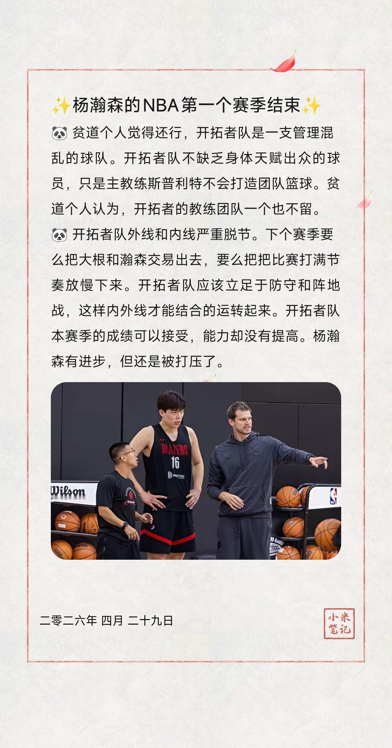 🐼 贫道个人觉得还行,开拓者队是一支管理混乱的球队。开拓者队不缺乏身体天赋出众的球员,只是主教练斯普利特不会打造团队篮球。贫道个人认为,开拓者的教练团队一个也不留。 🐼 开拓者队外线和内线严重脱节。下个赛季要么把大根和瀚森交易出去,要么把把比赛打满节奏放慢下来。开拓者队应该立足于防守和阵地战,这样内外线才能结合的运转起来。 🐼 开拓者队本赛季的成绩可以接受,能力却没有提高。杨瀚森有进步,但还是被打压了。期待他夏天的国家队表现吧!还有夏季联赛和季前赛。贫道对杨瀚森还是很看好了,终于平安的渡过了一个NBA赛季。可喜可贺! 作者:龙须面🧐