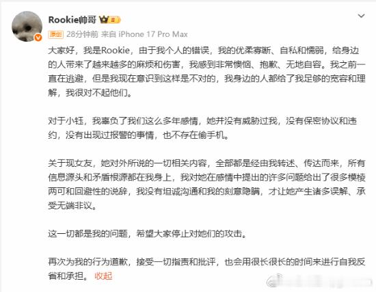 rookie发文致歉:呼吁停止攻击两位女性4 月 28 日晚,LPL 知名电竞选手 Rookie 发布微博长文,就近期持续发酵的恋情风波正式道歉,回应了现女友此前对前女友小钰的多项指控,将所有矛盾根源揽在自身,并呼吁网友停止对两位女性的攻击。在微博中,Rookie 首先承认自己的优柔寡断、自私和懦弱给身边人带来了伤害,为自己此前的逃避行为致歉。针对现女友此前的说法,他明确表示,现女友对外所说的所有内容,均是经由他转述而来,自己因回避沟通、刻意隐瞒给出了模棱两可的说辞,才让对方产生误解、承受非议,信息源头与矛盾根源全在自己身上。对于前女友小钰,Rookie 也公开否认了相关指控,称自己辜负了两人多年感情,小钰从未威胁过他,不存在所谓的保密协议、违约、报警或偷手机等行为,所有相关说法均不属实。他表示,这一切都是自己的问题,恳请大家停止对两位女性的攻击。随后,小钰也发布微博回应,称分手以来自己一直在积极调整状态,已走出阴霾,并未沉溺过去。她提到,从八年前至今,自己一直遭受网络嘲讽与无端揣测,当初公开分手时的平静,只是为了给这段感情最后的保护与礼貌,她希望这场闹剧到此结束,若后续仍有不实言论散播或侮辱行为,将采取法律手段维护权益。此前,Rookie 与小钰公开恋爱多年,今年 3 月官宣分手,后续 Rookie 现女友的爆料让这场分手风波迅速发酵,双方各执一词引发大量讨论。