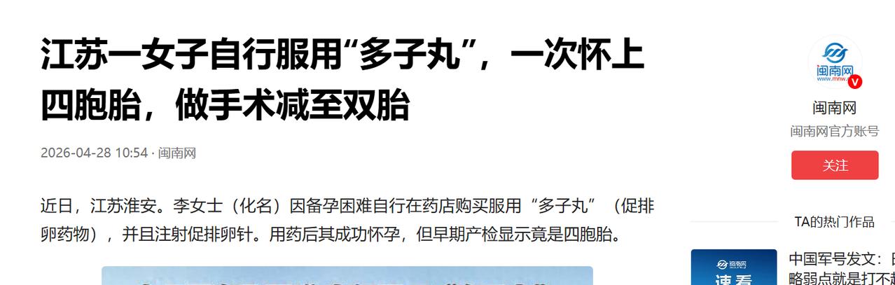江苏淮安的李女士一直渴望生育子女,为提高受孕概率,她私自购买了俗称 “多子丸” 的促排卵药物,还自行注射促排卵针。用药后成功怀孕,但产检显示竟是四胞胎,这让李女士一家又高兴又害怕…… 江苏淮安的李女士,今年30多岁的李女士,和丈夫结婚多年,一直盼着能有一个属于自己的孩子。 为了怀上宝宝,她试过调理身体、吃偏方、看中医等各种方法,可肚子始终没有动静。 看着身边的亲戚朋友一个个都有了孩子,李女士心里越发着急,夜里常常失眠,连夫妻二人的心情都变得沉重起来。 李女士在网上刷到有人说“多子丸”能快速受孕,还能怀上多胞胎,附上的“成功案例”让她动了心。 之后,李女士没有去正规医院咨询医生,也没有开具处方,直接去家附近药店买下了“多子丸”,也就是临床常用的促排卵药物。 她还照着网上的方法自行注射促排卵针,全程没有专业人员指导监测,全凭自己的想法用药。 直到某天,她用验孕试纸测出两条清晰的杠,瞬间红了眼眶,丈夫看到后也激动得说不出话,夫妻俩紧紧抱在一起,多年的期盼终于有了回应。 怀孕早期,李女士去淮安市妇幼保健院做产检,当医生说出“你怀的是四胞胎”时,她和丈夫脸上的笑容瞬间消失,只剩下震惊和惶恐。 原本以为的“多福”,变成了沉甸甸的压力,那种又喜又怕的心情,只有经历过的人才能体会。 接诊医生结合李女士的身体状况和产检报告,给出了客观专业的评估,打破了一家人的侥幸心理。 医生表示,四胞胎属于极高风险多胎妊娠,对母体和胎儿都有巨大健康威胁,远超普通家庭承受范围。 对母体而言,多胎妊娠会让妊娠期高血压、糖尿病、产后大出血等并发症概率成倍增加,严重时危及生命; 对胎儿来说,早产、极低出生体重等问题几率大幅上升,强行保留四个胎儿,大概率全部无法顺利存活。 听完医生的讲解,李女士和家人陷入了痛苦的纠结。 一边是好不容易得来的四个骨肉,放弃任何一个都于心不忍;一边是无法忽视的风险,强行坚持可能让母子陷入绝境。 经过反复商量权衡,他们最终听从医生建议,接受孕早期减胎手术,保障李女士安全和剩余胎儿正常发育。 医疗团队术前细致筛查四个胚胎,选出发育最好、着床最稳定的两个,手术全程规范,术后李女士无明显并发症,双胎胚胎发育稳定,一家人悬着的心才稍稍放下。 心疼她备孕多年的煎熬,理解她求子心切的心情,却也惋惜她因心急忽视医学常识,差点酿成大错。 促排卵药物用对了是“天使”,用错了就是“炸弹”,不当使用会导致卵巢异常肿大、腹水等症状,严重时损伤肝肾功能、形成血栓,甚至危及生命。 备孕本就没有捷径,正规流程应是夫妻双方共同做全面体检,排查不孕原因,由医生制定针对性方案,即便需用促排卵药物,也必须在医生全程监护下进行。 我们能理解备孕家庭的迫切和不易,但越是着急,越要冷静相信科学,不能拿自己和孩子的健康赌侥幸。 信息来源: 闽南网 4月28日 江苏一女子自行服用”多子丸”,一次怀上四胞胎,做手术减至双胎