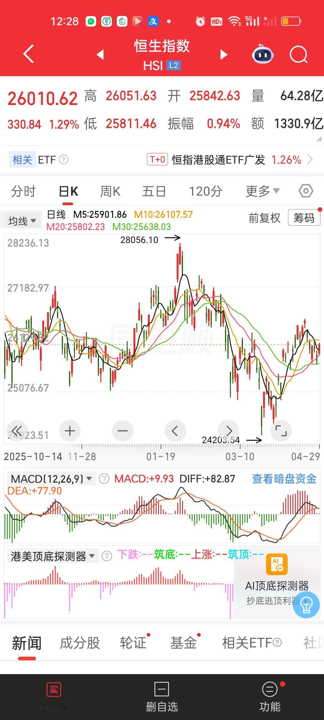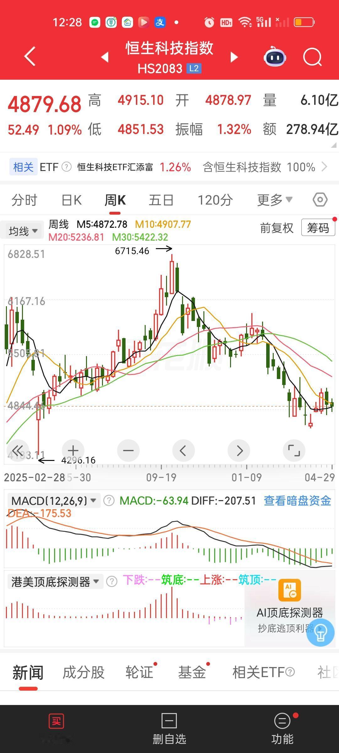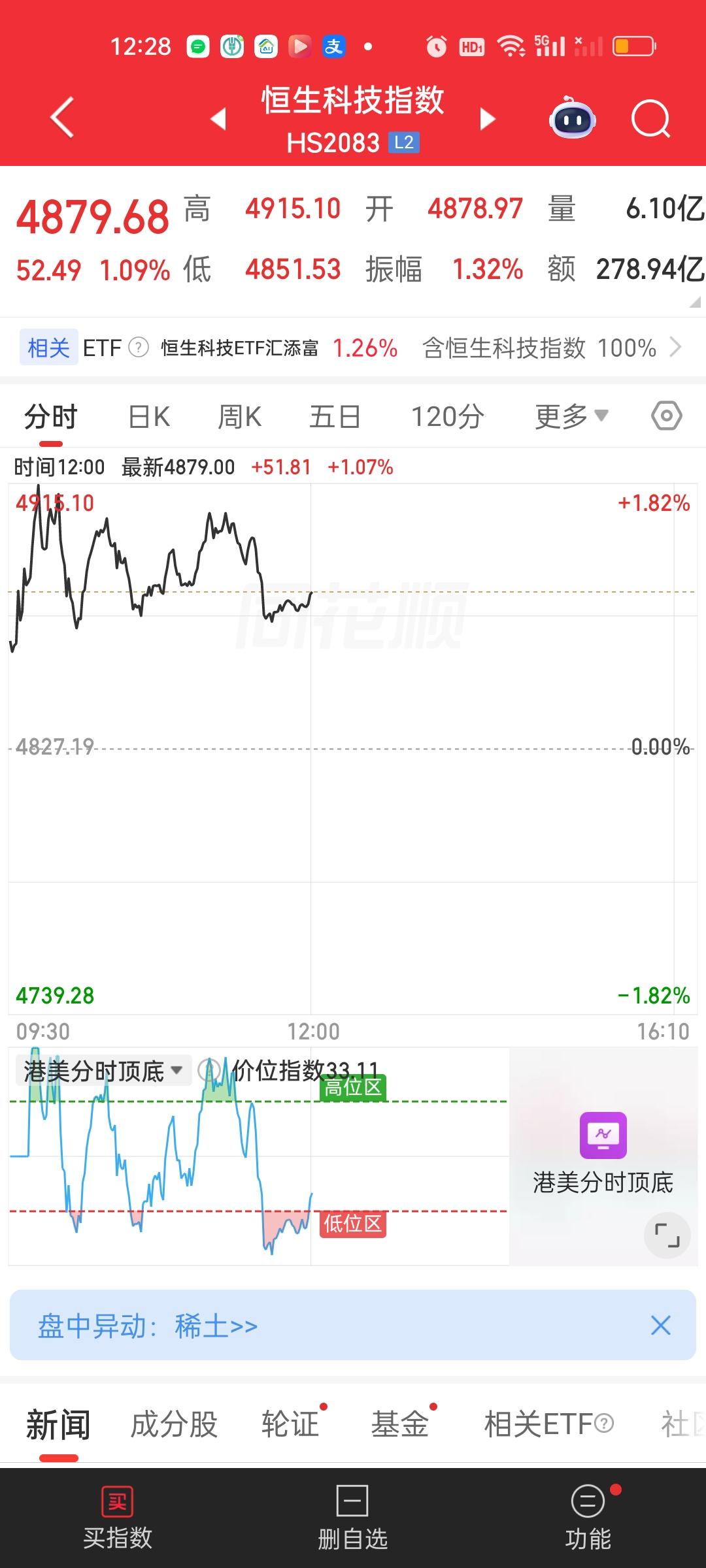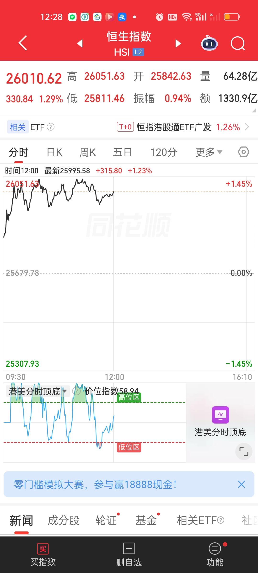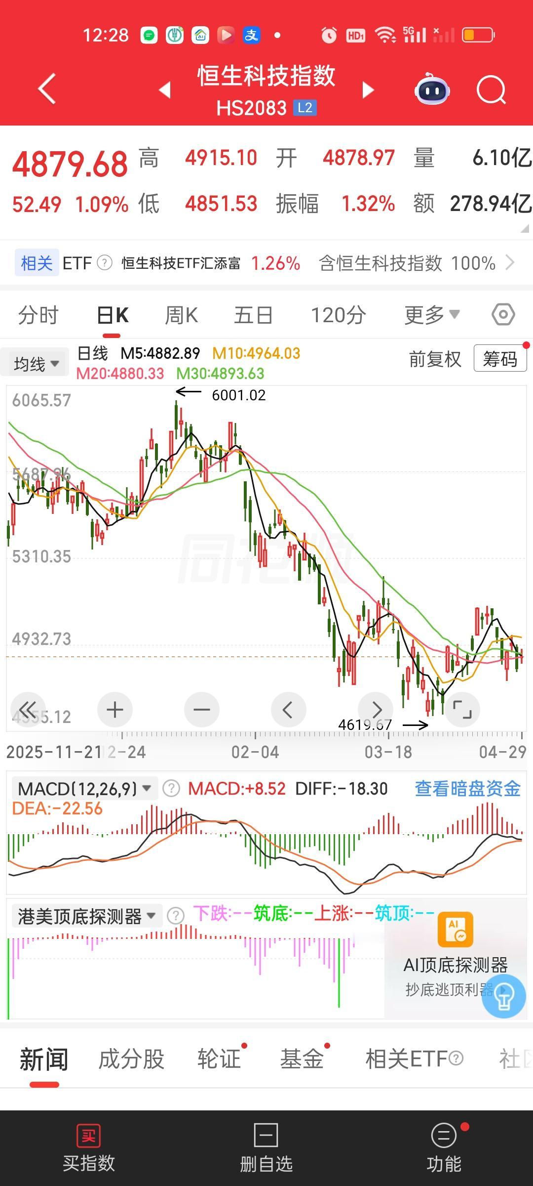 港股今天也是一改颓势,中午收盘恒指涨了330点。恒科也涨了1.09%,尽管涨幅不是特别大,但只要能涨终究是好的。恒指就差10日线没有站上,恒科尽管一条线都没站上,但距离5日20日30日都只差一点点。希望下午能涨多一些!