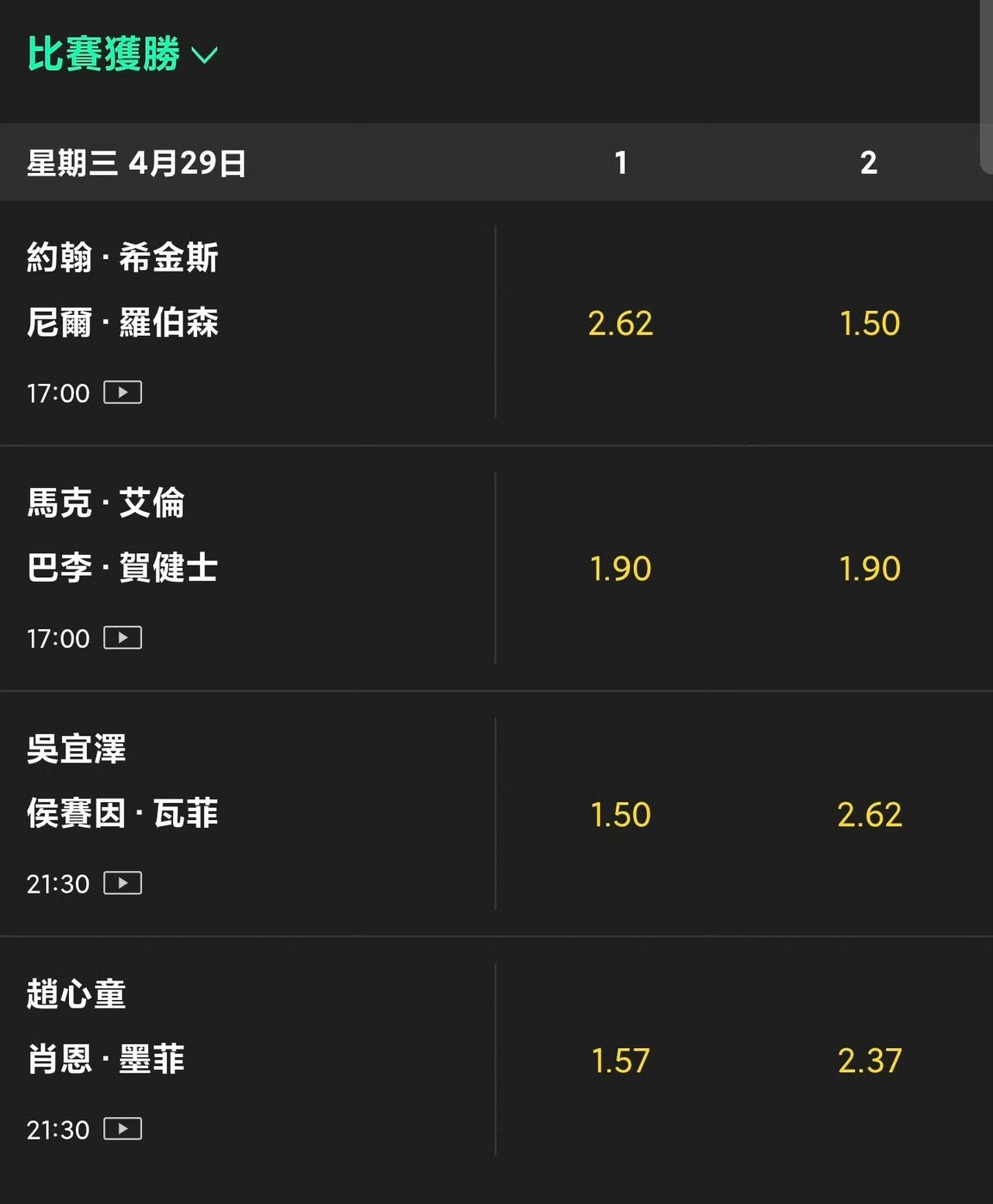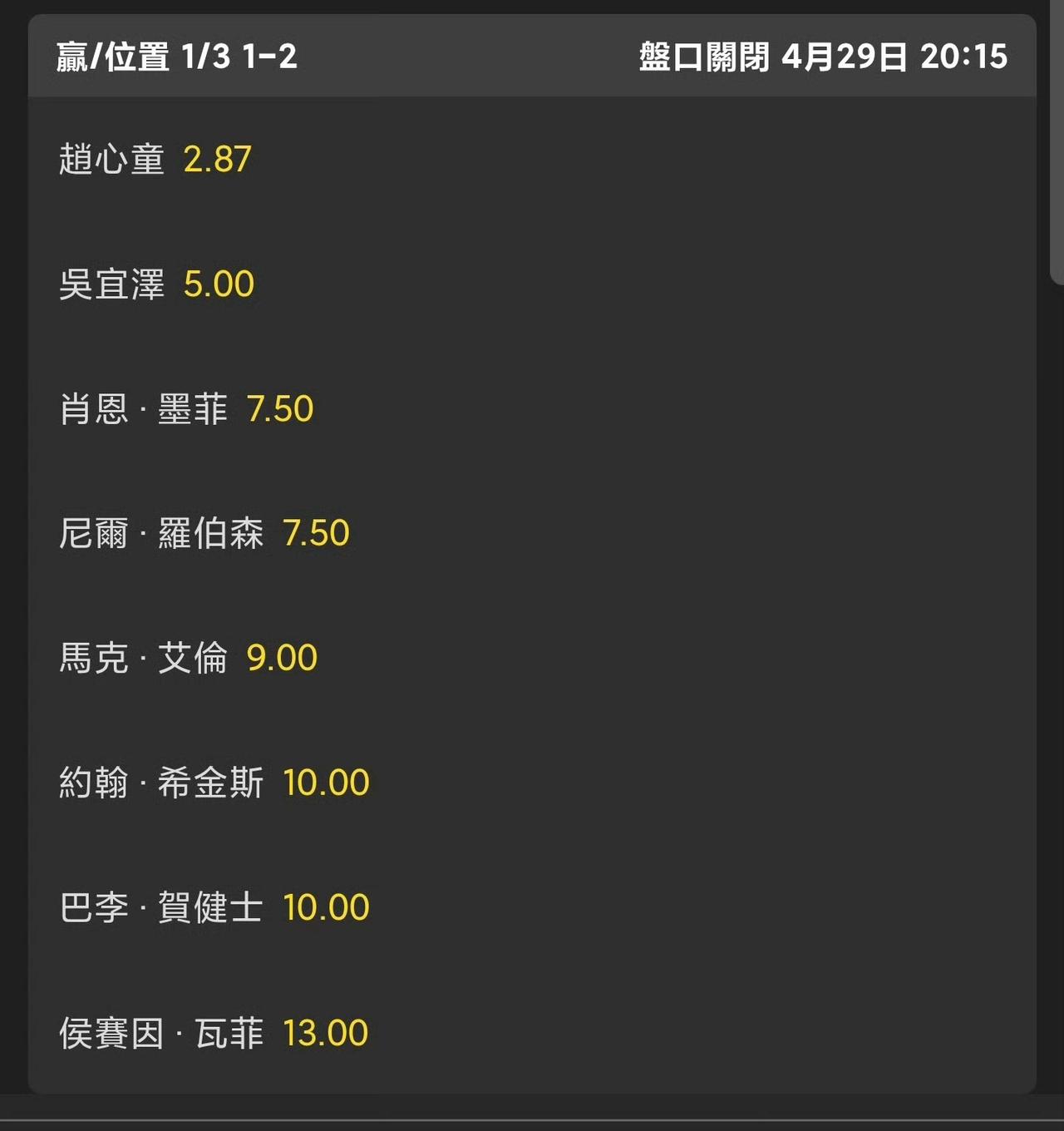斯诺克世锦赛目前夺冠赔率,一夜之间就会重新排名。 希望赵吴会师决赛的纯属意淫,看看墨菲瓦菲同意吗?大热必死,赔率排名前二不是好事。 自己给自己降温,别炒了。