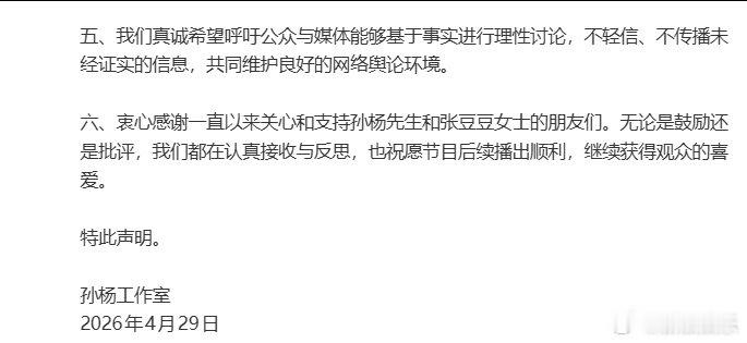 孙杨方回应争议妻子节目组称未收到删除内容要求 29日,发声明回应“孙杨妈妈致电节目组删除嘉宾言论”、“半夜打电话教育女PD”等传闻,称均为恶意捏造,毫无事实依据。孙杨与张豆豆及家人自始至终积极配合节目组工作与需求,遵从专业安排。从未干涉过节目组的最终剪辑权与播出决定。
