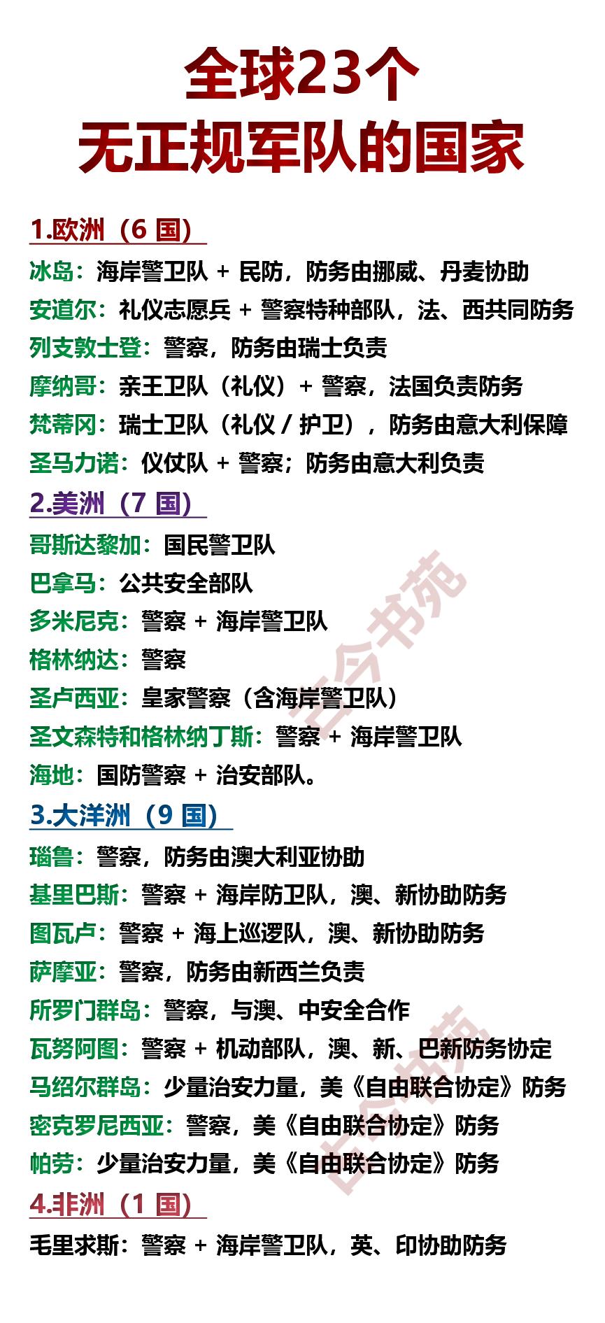 全球,有多少个国家没有正规军队? 答案:23个。 这里所述的无正规军队国家,指的是无常备作战军队,仅保留警察或礼仪卫队等的国家。 为了方便读者观看,特意将这23个国家的所在区域、国家名称、国内力量以及防务负责情况等,整理成了一张图片,从图片中不难看出: 这些国家只拥有警察和简单的护卫队,也就是负责国内的治安管理。 至于国防就由别的国家协助或依赖当地区域安全体系。 有人会提问:那小日子呢? 实话实说,它是有的,虽然在法律上小日子没有,但是它拥有的自卫队,确是一支实打实的军事力量。