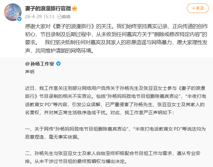 妻子节目组称未收到删除内容要求 《妻子》节目组:节目录制及后期过程中,从未收到任何嘉宾方关于“删除或修改特定内容”的要求。