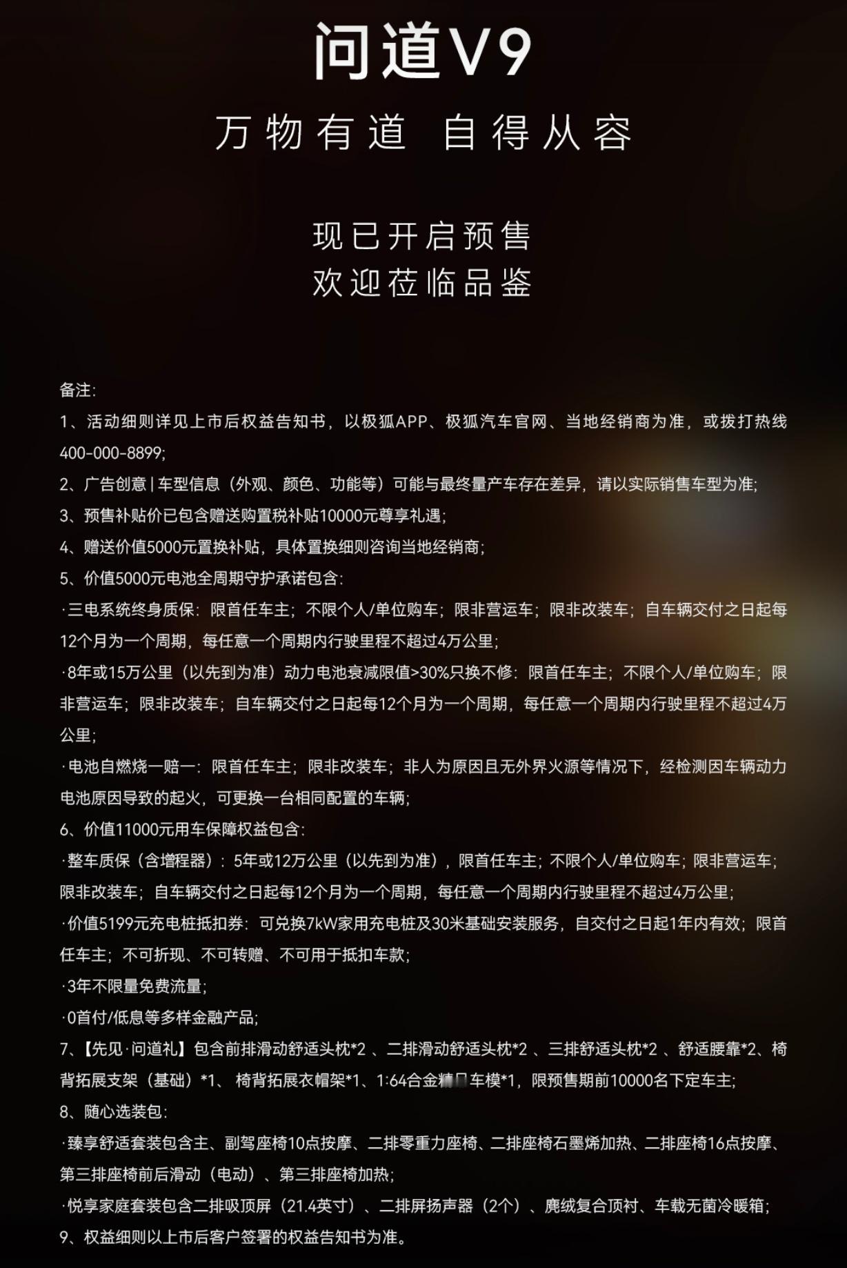 21.99万起!极狐问道V9预售,MPV市场杀疯了! 全域舒享旗舰MPV极狐问道V9正式开启预售,补贴后21.99万元起! 预售期间付5000元定金,就能享限时多重权益。作为北汽极狐的诚意之作,它还带着“MPV欠大家一个防滚梁”的硬核配置来势汹汹,空间、舒适、安全全拉满,直接把MPV卷出新高度! 预算20多万想入MPV的车友,这波预售福利别错过,冲就完事儿! 极狐问道V9 MPV 极狐汽车