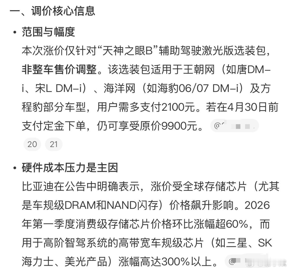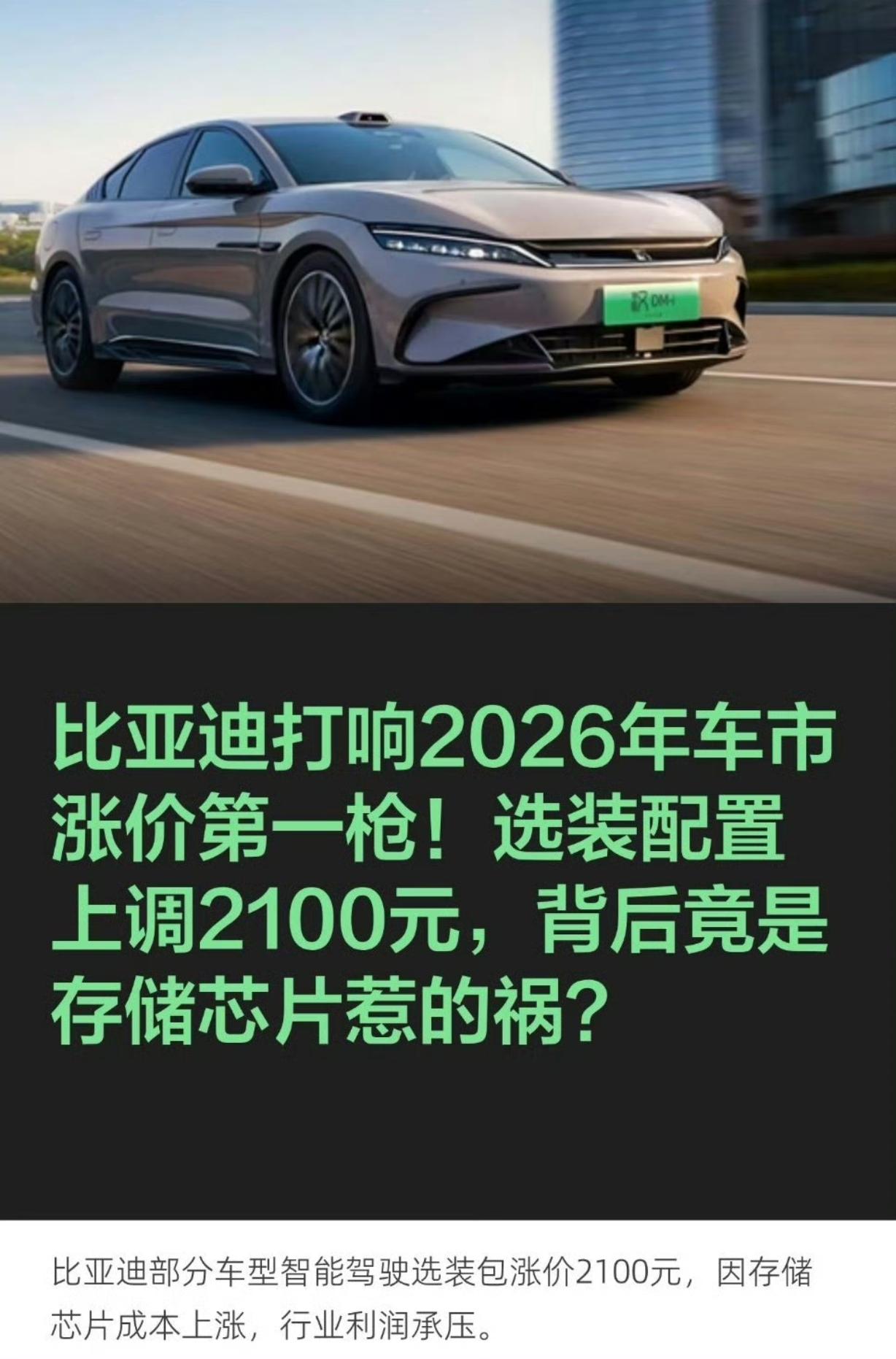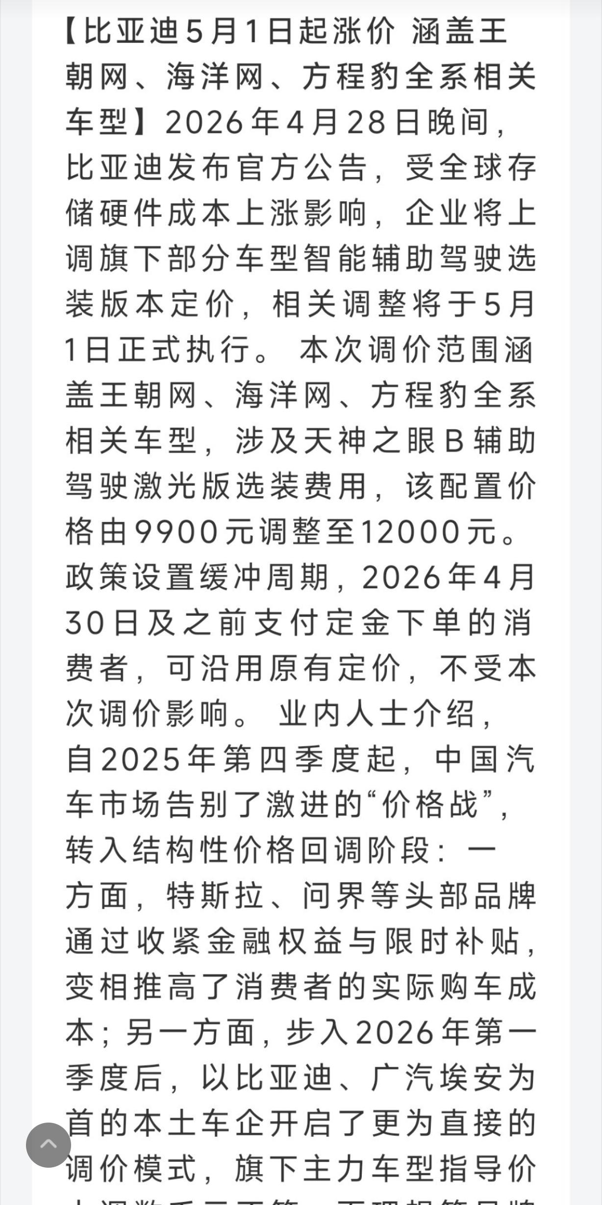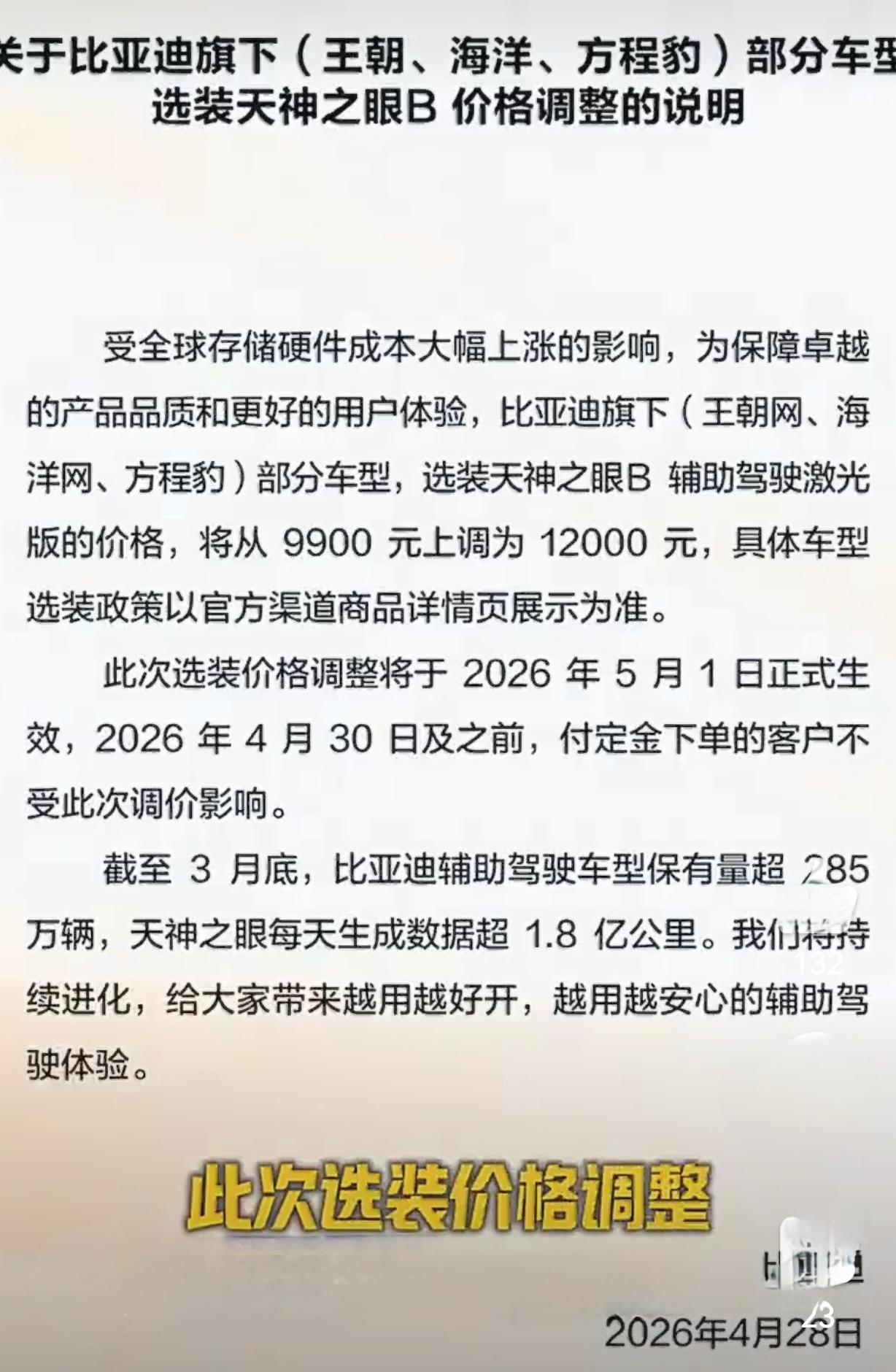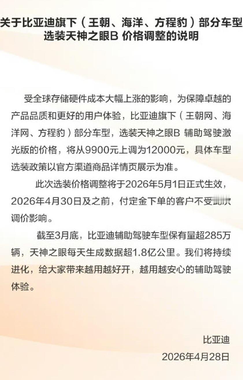比亚迪官宣重要调价!4月28日起,旗下王朝网、海洋网、方程豹部分车型,天神之眼B辅助驾驶激光版选装价,从9900元涨至12000元,5月1日正式执行 。 此次仅针对激光版智驾包,基础车价不变!4月30日及之前付定金订单,仍享原价,不受涨价影响。 官方解释为全球存储硬件成本大涨,车规级DRAM芯片价格飙升,智驾系统成本承压 。作为比亚迪自研中高端智驾方案,天神之眼B适配汉、唐、海豹等主力车型,3月比亚迪销量稳居榜首,此次调价实属无奈之举。 比亚迪 天神之眼 智能驾驶