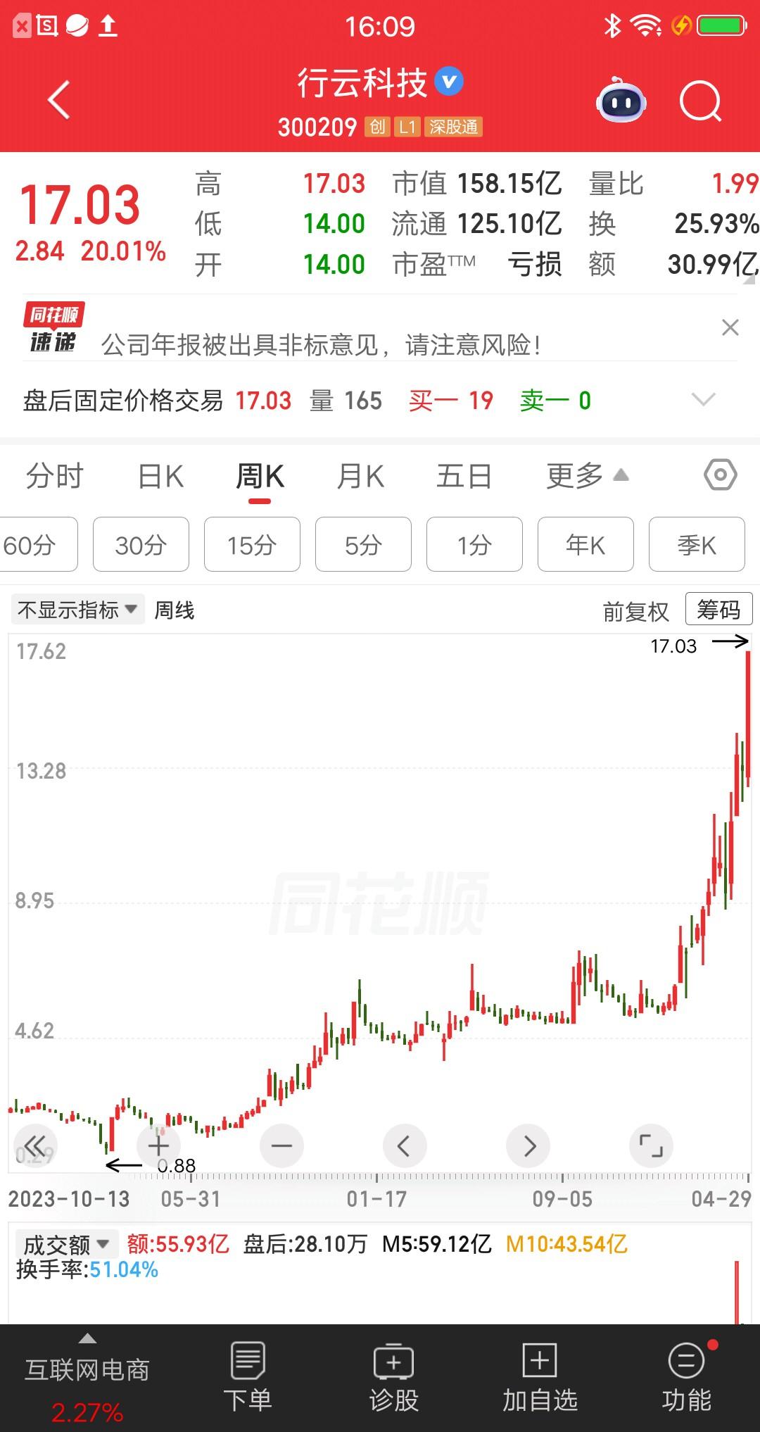 非常低调,股价从0.88元涨到17.03元,涨幅超过18倍。业绩烂的不行,全靠一个热门的概念。 行云科技本来叫有棵树,2024年2月份跌到历史最低价0.88元。原因是业绩连续巨亏,把家底都败干了,叠加破产重整的利空,股价一泻千里呀。此后完成破产重整,股票摘帽成功,并改名为行云科技。此后股价震荡走高,近期加速上涨,妥妥的黑马股一枚呀。 公司业绩如何呢,一季报亏损2204万,同比下降12845%。年报还被出具了非标意见,实打实的绩差股。 业绩不行概念来凑,公司签了5年服务器租赁大单,又是成立算力子公司。于是就有了算力概念,这可是市场疯狂追捧的题材呀。 大家别误会,并非让大家去买。所有的高位股,都应该警惕起来了,一旦开启主跌浪,会很惨的。